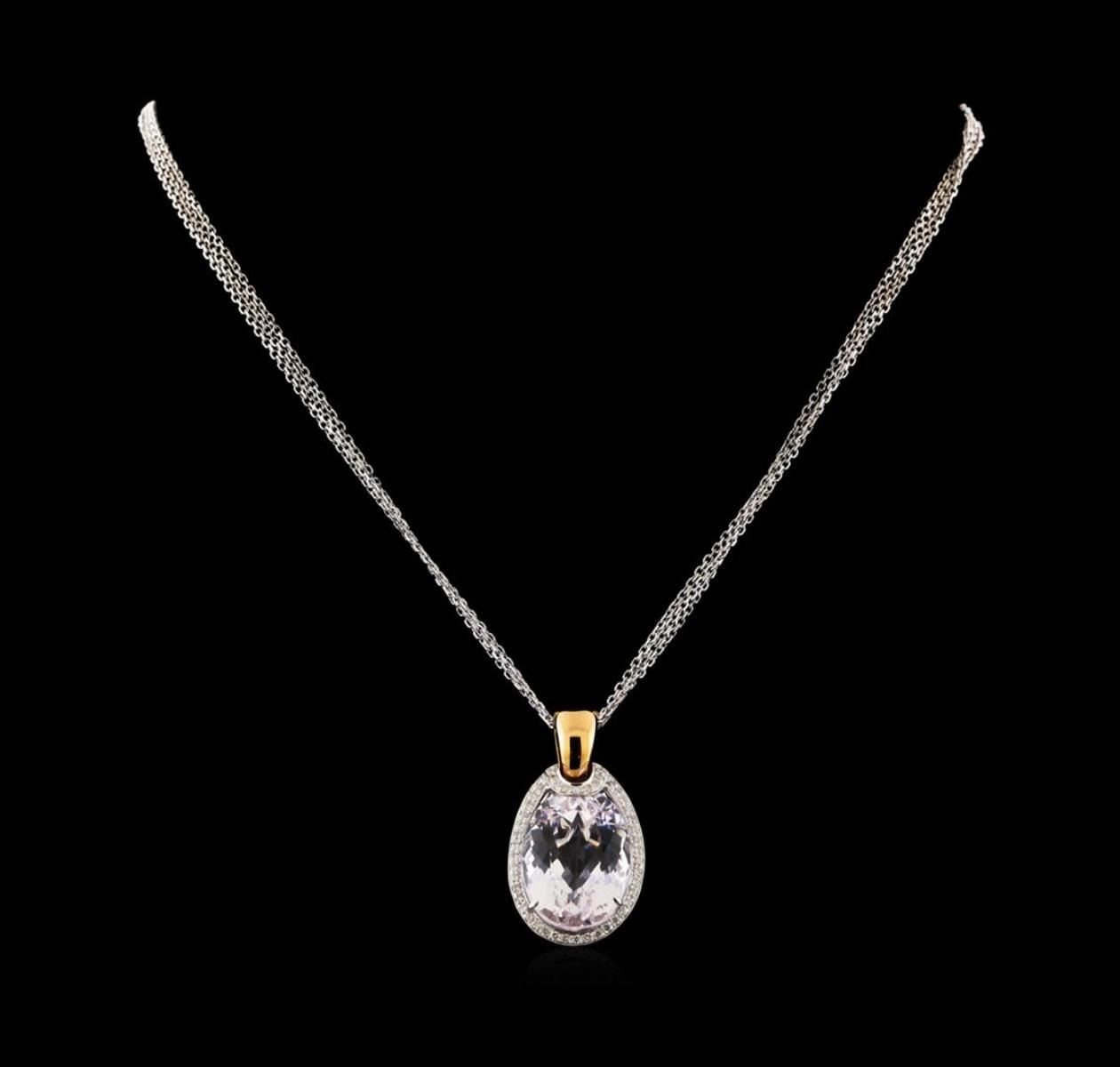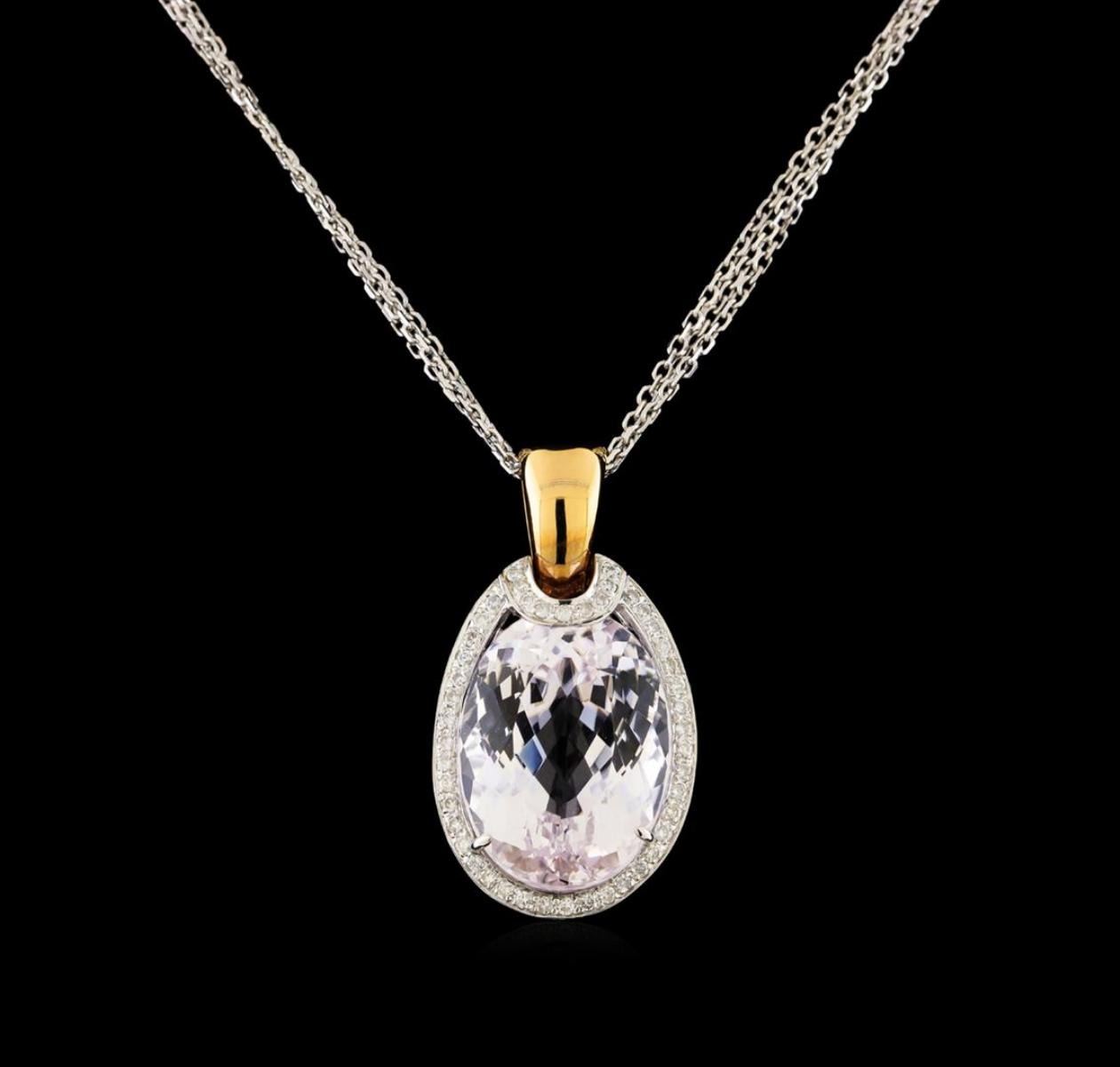 One electronically tested 18KT rose and white gold lady's combination cast & assembled fashion pendant & chain 18.0" long, 1.3mm diamond cut oval cable link with a lobster claw clasp with a bright polish finish. The featured lady's pendant has an adjustable triple chain that can be worn between sixteen and eighteen inches long. Identified with markings of "18K". Condition is new, good workmanship. Containing: One prong set oval modified brilliant cut natural kunzite, measuring 20.00 x 15.06 x 10.86mm, (depth est.) 5%. bulge factor, approximate weight of 23.02ct., clarity is eye clean, very light, very slightly grayish, purple red color, (GIA PR 2/3), cut is very good. Transmitting light with no distortion, transparent. Colored gemstones are presumed to have been subjected to commonly used enhancement processes. Graded in the setting. Forty-Six bead set round brilliant cut diamonds, measuring 1.35 - 1.30 x 0.82mm (depth est.) approximate total weight of 46 Stones = 0.40ct. Graded in the setting. Clarity: SI-1 to I-1. Color: G - Good. Total Weight of Colored Stones 23.02ct. Total Weight of Diamonds 0.40ct. Total Weight of Pendant & Chain 19.10gm. GAS Appraised.