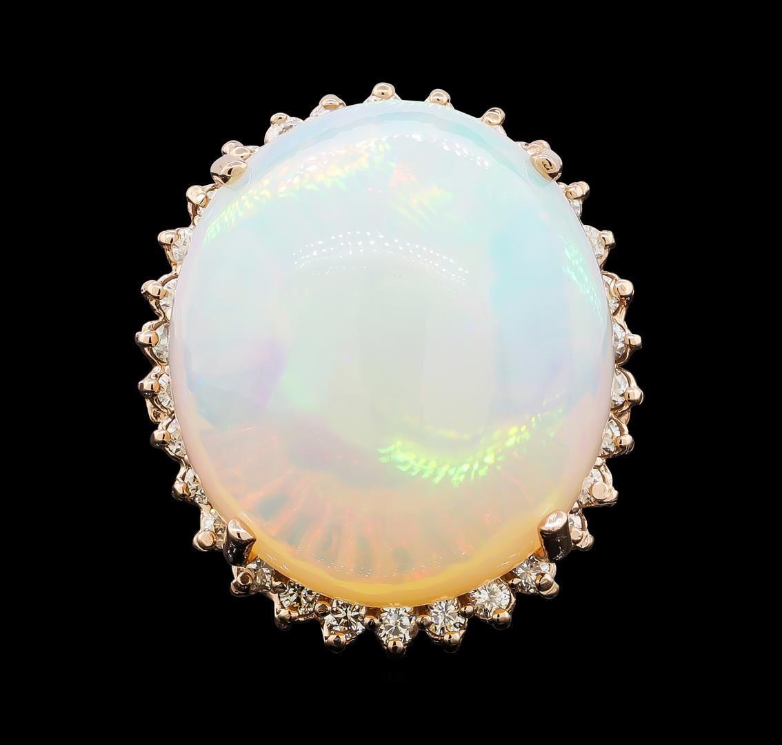 One electronically tested 14KT rose gold lady's cast fashion ring with a basket halo with a bright polish finish. The featured lady's ring has a shank measuring 2.77 millimeters wide. Identified with markings of 'K14'. Condition is new, good workmanship. Containing: One crystal opal that is cut in a oval shaped cabochon and is prong set, measuring 23.37 mm long x 20.60 mm wide, and 12.44 mm thick and the approximate weight is 23.03 carats. The opal has a somewhat bright, multicolor play of color (fire) in a rolling flashfire pattern; a high dome; a good cut; no inclusions; consistent in its brightness and pattern; and is not directional. Graded in the setting. Thirty prong set round brilliant cut diamonds, measuring 2.10 - 2.00 x 1.25mm (depth est.) approximate total weight of 30 Stones = 0.96ct. Graded in the setting. Clarity SI-1 to SI-2. Color: G - H Cut Good. Total Weight of Diamonds 0.96ct.. Total Weight of Opals 23.03ct.. Total Weight of Ring 14.20gm. GAS Appraised at $8,950.00.