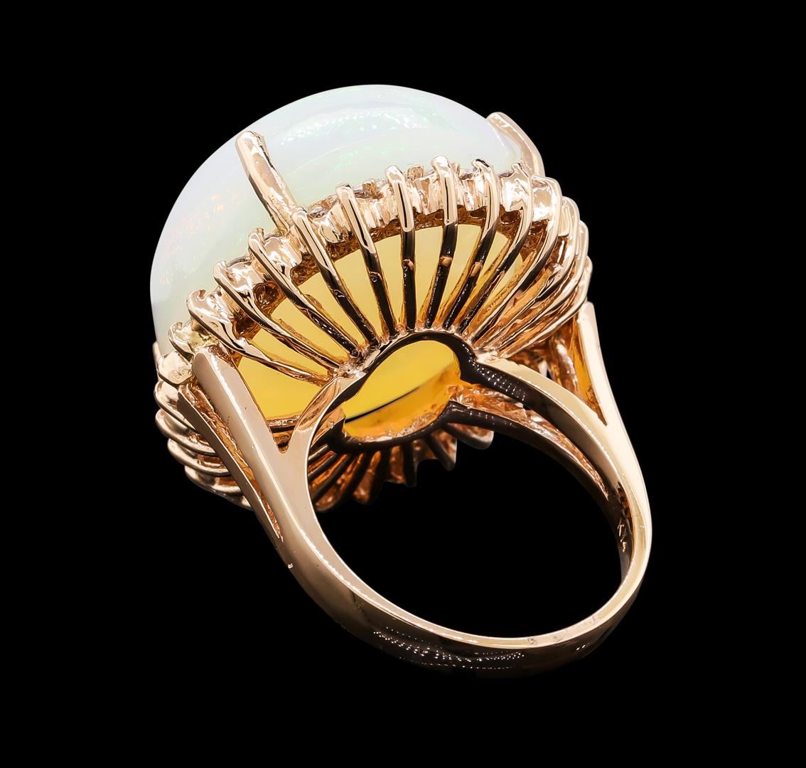 One electronically tested 14KT rose gold lady's cast fashion ring with a basket halo with a bright polish finish. The featured lady's ring has a shank measuring 2.77 millimeters wide. Identified with markings of 'K14'. Condition is new, good workmanship. Containing: One crystal opal that is cut in a oval shaped cabochon and is prong set, measuring 23.37 mm long x 20.60 mm wide, and 12.44 mm thick and the approximate weight is 23.03 carats. The opal has a somewhat bright, multicolor play of color (fire) in a rolling flashfire pattern; a high dome; a good cut; no inclusions; consistent in its brightness and pattern; and is not directional. Graded in the setting. Thirty prong set round brilliant cut diamonds, measuring 2.10 - 2.00 x 1.25mm (depth est.) approximate total weight of 30 Stones = 0.96ct. Graded in the setting. Clarity SI-1 to SI-2. Color: G - H Cut Good. Total Weight of Diamonds 0.96ct.. Total Weight of Opals 23.03ct.. Total Weight of Ring 14.20gm. GAS Appraised at $8,950.00.
