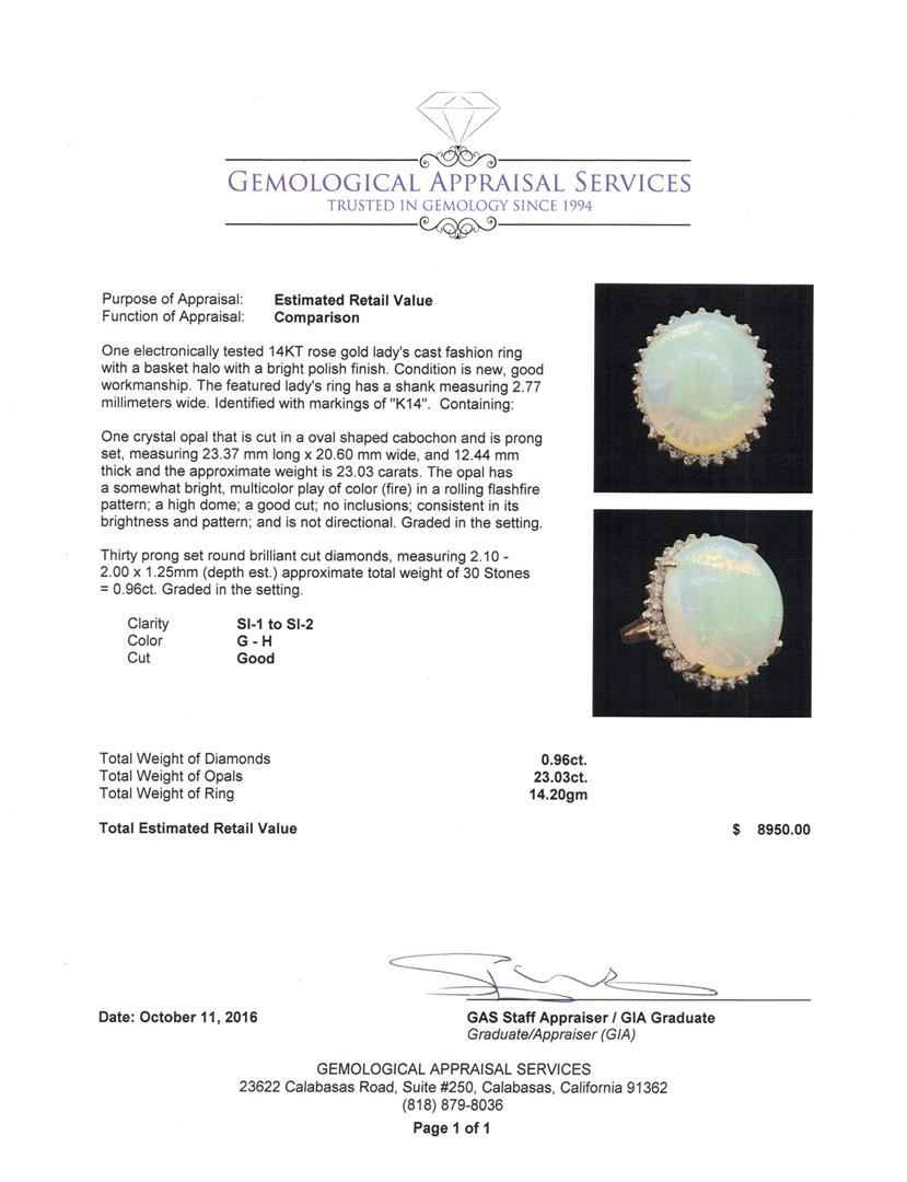 One electronically tested 14KT rose gold lady's cast fashion ring with a basket halo with a bright polish finish. The featured lady's ring has a shank measuring 2.77 millimeters wide. Identified with markings of 'K14'. Condition is new, good workmanship. Containing: One crystal opal that is cut in a oval shaped cabochon and is prong set, measuring 23.37 mm long x 20.60 mm wide, and 12.44 mm thick and the approximate weight is 23.03 carats. The opal has a somewhat bright, multicolor play of color (fire) in a rolling flashfire pattern; a high dome; a good cut; no inclusions; consistent in its brightness and pattern; and is not directional. Graded in the setting. Thirty prong set round brilliant cut diamonds, measuring 2.10 - 2.00 x 1.25mm (depth est.) approximate total weight of 30 Stones = 0.96ct. Graded in the setting. Clarity SI-1 to SI-2. Color: G - H Cut Good. Total Weight of Diamonds 0.96ct.. Total Weight of Opals 23.03ct.. Total Weight of Ring 14.20gm. GAS Appraised at $8,950.00.
