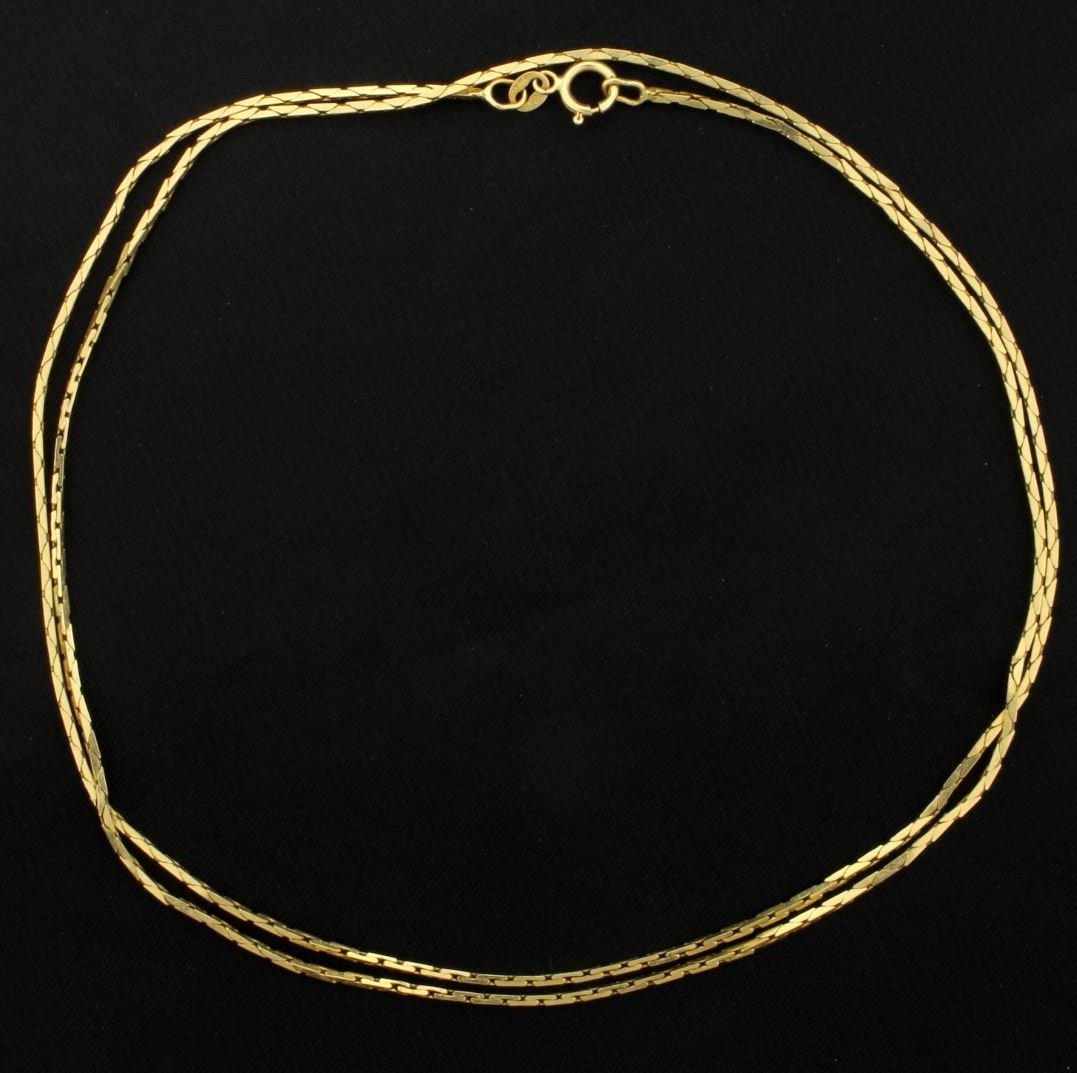 In 14K yellow gold, it is .94mm thick and has a lobster clasp. 5.6g