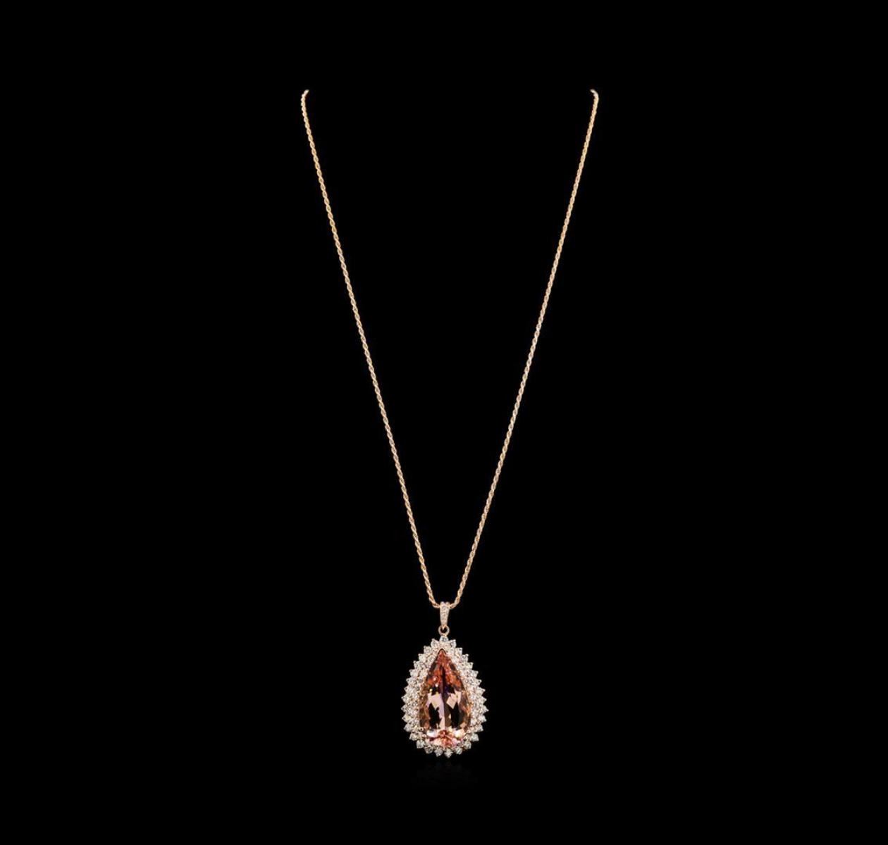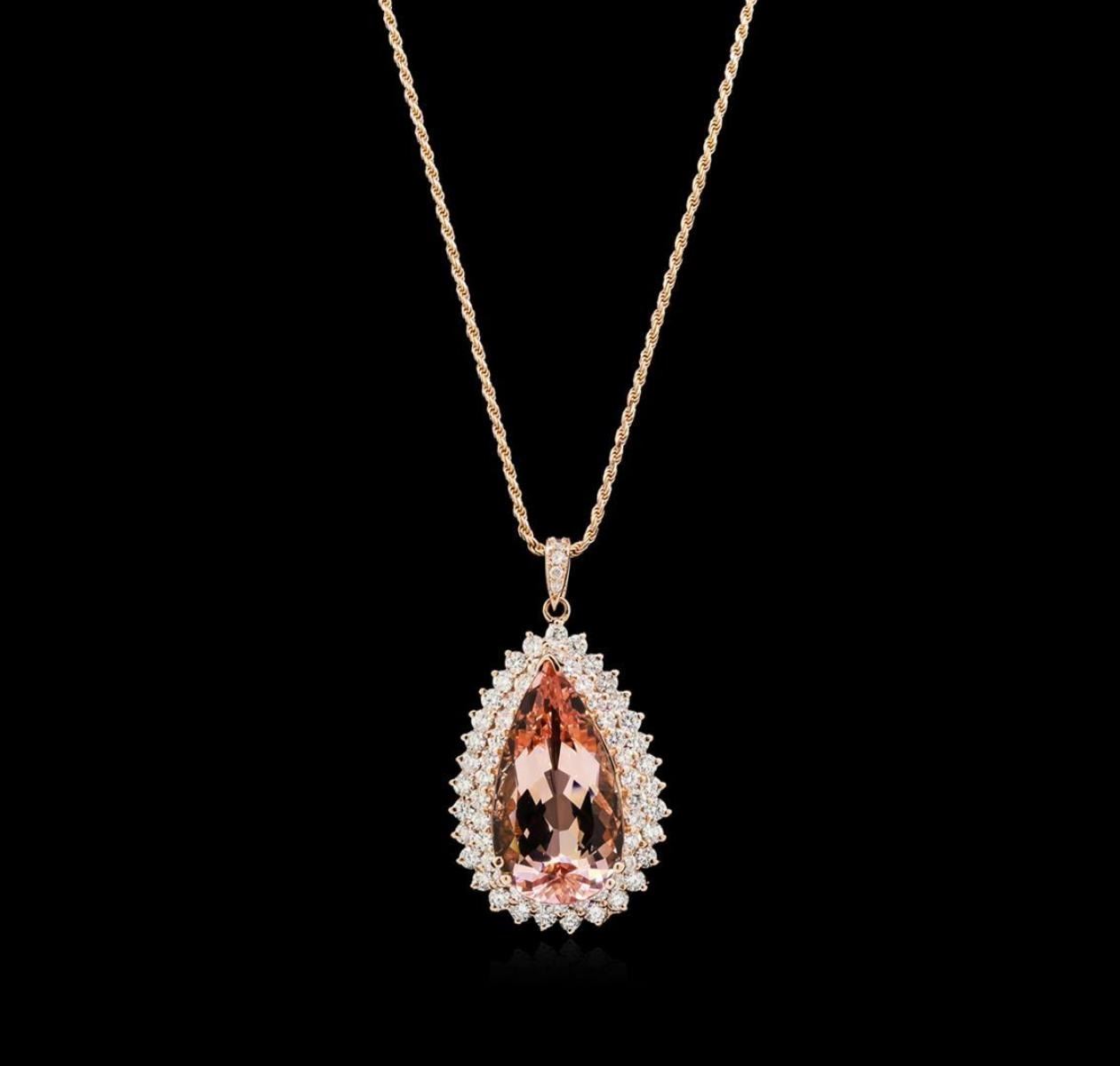 One electronically tested 14KT rose gold lady's combination cast & assembled fashion pendant & chain 18.0" long, 1.5mm diamond cut rope chain with a lobster claw clasp with a bright polish finish. Identified with markings of "14K". Condition is new, good workmanship. Containing: One prong set pear modified brilliant cut natural morganite, measuring 26.60 x 15.06 x 10.30mm, 3%. bulge factor, approximate weight of 23.16ct., clarity is eye clean, type I, light, very slightly brownish, orangy red color, (GIA oR 3/3), cut is very good. Transmitting light with no distortion, transparent. Colored gemstones are presumed to have been subjected to commonly used enhancement processes. Graded in the setting. Thirty-One prong set round brilliant cut diamonds, measuring 2.60 - 2.50 x 1.58mm (depth est.) approximate total weight of 31 Stones = 1.94ct. Graded in the setting. Clarity: VS-2 to SI-2. Color: H - I. Cut Good Thirty prong set round brilliant cut diamonds, measuring 2.40 - 2.30 x 1.46mm (depth est.) approximate total weight of 30 Stones = 1.48ct. Graded in the setting. Clarity: VS-2 to SI-2. Color: G - I. Cut Good Five prong set round brilliant cut diamonds, measuring 2.10 - 1.40 x 1.09mm (depth est.) approximate total weight of 5 Stones = 0.12ct. Graded in the setting. Clarity: SI-1 to SI-2. Color: H - I. Cut Good. Total Weight of Colored Stones 23.16ct. Total Weight of Diamonds 3.54ct. Total Weight of Pendant & Chain 20.70gm. GAS Appraised.