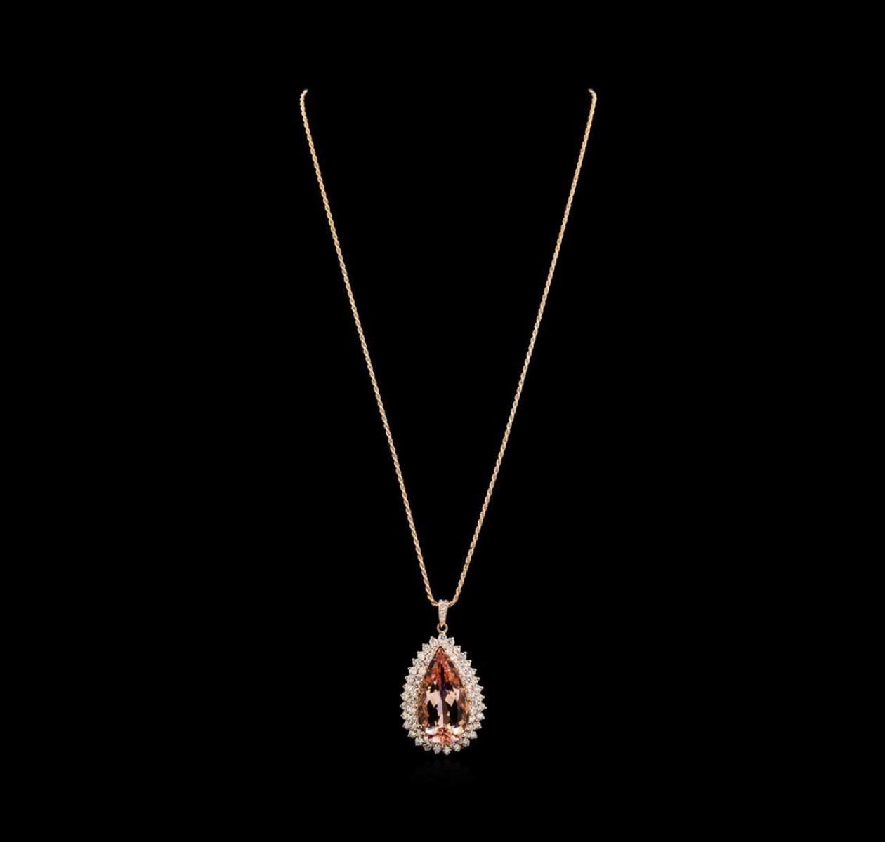 One electronically tested 14KT rose gold lady's combination cast & assembled fashion pendant & chain 18.0" long, 1.5mm diamond cut rope chain with a lobster claw clasp with a bright polish finish. Identified with markings of "14K". Condition is new, good workmanship. Containing: One prong set pear modified brilliant cut natural morganite, measuring 26.60 x 15.06 x 10.30mm, 3%. bulge factor, approximate weight of 23.16ct., clarity is eye clean, type I, light, very slightly brownish, orangy red color, (GIA oR 3/3), cut is very good. Transmitting light with no distortion, transparent. Colored gemstones are presumed to have been subjected to commonly used enhancement processes. Graded in the setting. Thirty-One prong set round brilliant cut diamonds, measuring 2.60 - 2.50 x 1.58mm (depth est.) approximate total weight of 31 Stones = 1.94ct. Graded in the setting. Clarity: VS-2 to SI-2. Color: H - I. Cut Good Thirty prong set round brilliant cut diamonds, measuring 2.40 - 2.30 x 1.46mm (depth est.) approximate total weight of 30 Stones = 1.48ct. Graded in the setting. Clarity: VS-2 to SI-2. Color: G - I. Cut Good Five prong set round brilliant cut diamonds, measuring 2.10 - 1.40 x 1.09mm (depth est.) approximate total weight of 5 Stones = 0.12ct. Graded in the setting. Clarity: SI-1 to SI-2. Color: H - I. Cut Good. Total Weight of Colored Stones 23.16ct. Total Weight of Diamonds 3.54ct. Total Weight of Pendant & Chain 20.70gm. GAS Appraised.