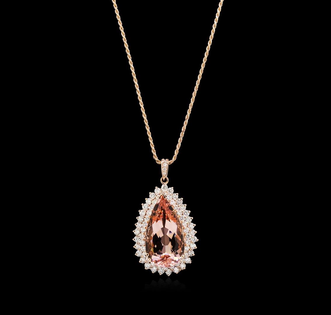 One electronically tested 14KT rose gold lady's combination cast & assembled fashion pendant & chain 18.0" long, 1.5mm diamond cut rope chain with a lobster claw clasp with a bright polish finish. Identified with markings of "14K". Condition is new, good workmanship. Containing: One prong set pear modified brilliant cut natural morganite, measuring 26.60 x 15.06 x 10.30mm, 3%. bulge factor, approximate weight of 23.16ct., clarity is eye clean, type I, light, very slightly brownish, orangy red color, (GIA oR 3/3), cut is very good. Transmitting light with no distortion, transparent. Colored gemstones are presumed to have been subjected to commonly used enhancement processes. Graded in the setting. Thirty-One prong set round brilliant cut diamonds, measuring 2.60 - 2.50 x 1.58mm (depth est.) approximate total weight of 31 Stones = 1.94ct. Graded in the setting. Clarity: VS-2 to SI-2. Color: H - I. Cut Good Thirty prong set round brilliant cut diamonds, measuring 2.40 - 2.30 x 1.46mm (depth est.) approximate total weight of 30 Stones = 1.48ct. Graded in the setting. Clarity: VS-2 to SI-2. Color: G - I. Cut Good Five prong set round brilliant cut diamonds, measuring 2.10 - 1.40 x 1.09mm (depth est.) approximate total weight of 5 Stones = 0.12ct. Graded in the setting. Clarity: SI-1 to SI-2. Color: H - I. Cut Good. Total Weight of Colored Stones 23.16ct. Total Weight of Diamonds 3.54ct. Total Weight of Pendant & Chain 20.70gm. GAS Appraised at $22,895.00.