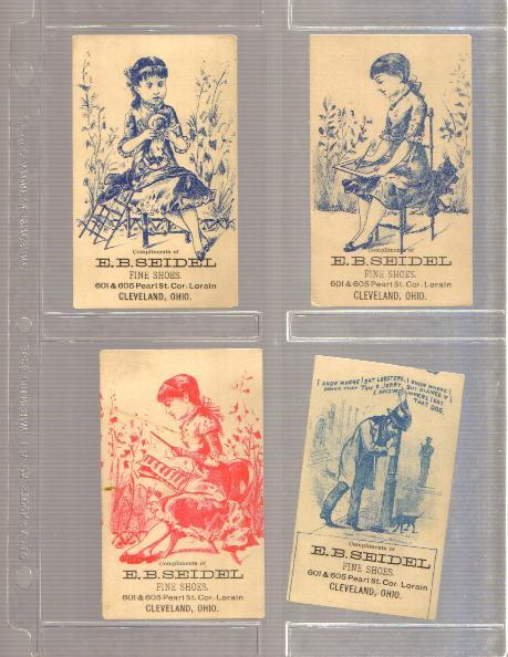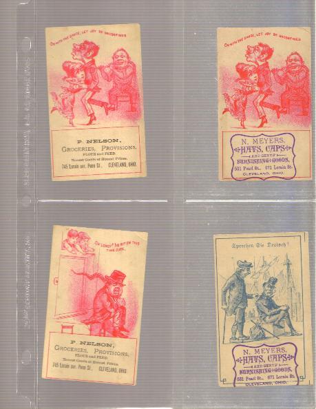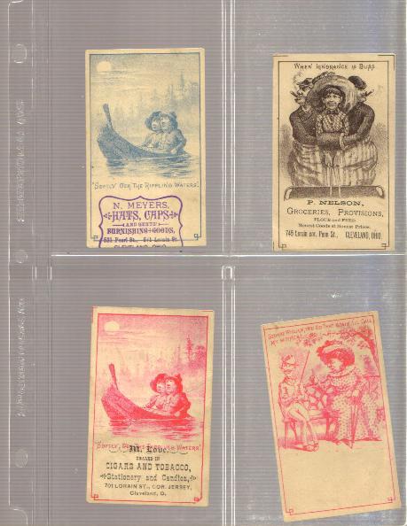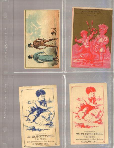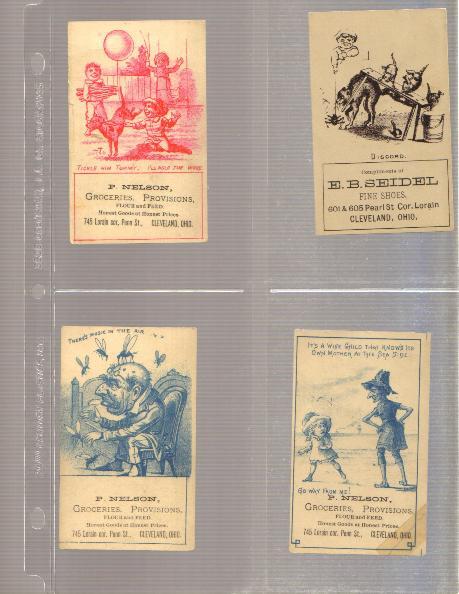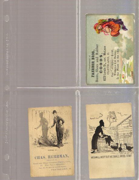 Interesting assortment of (23)trade cards from the 19th c. in pages. Most are retailers trade cards for groceries, clothing, etc. Est.$30-50
