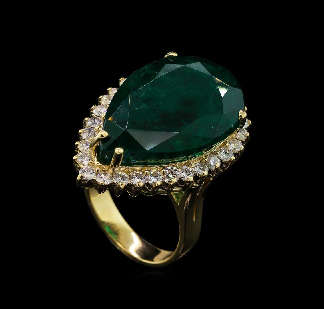 One electronically tested 14KT yellow gold lady's cast fashion ring with a basket halo with a bright polish finish. The featured lady's ring has a shank measuring 3.54 millimeters wide. Identified with markings of 'K14'. Condition is new, good workmanship. Containing: One prong set pear modified mixed cut natural emerald, measuring 23.74 x 15.45 x 9.71mm, (depth est.) 20%. bulge factor, approximate weight of 23.22ct., clarity is heavily included, medium dark, strong, green color, (GIA G 6/5), cut is good. Transmitting light somewhat diffusely, semi-transparent to translucent. Naturally occurring internal & external characteristics are present. Indications of oil residue. Clarity enhanced. Colored gemstones are presumed to have been subjected to commonly used enhancement processes. Graded loose prior to setting in the GIA Laboratory, Report #1156961793. Twenty-Nine prong set round brilliant cut diamonds, measuring 2.30 - 2.20 x 1.40mm (depth est.) approximate total weight of 29 Stones = 1.25ct. Graded in the setting. Clarity SI-1 to I-1. Color: H - I Cut Good. Total Weight of Colored Stones 23.22ct.. Total Weight of Diamonds 1.25ct.. Total Weight of Ring 12.90gm GAS Appraised at $32,610.00.