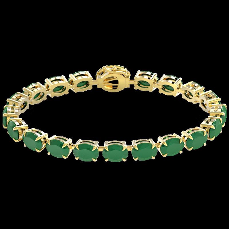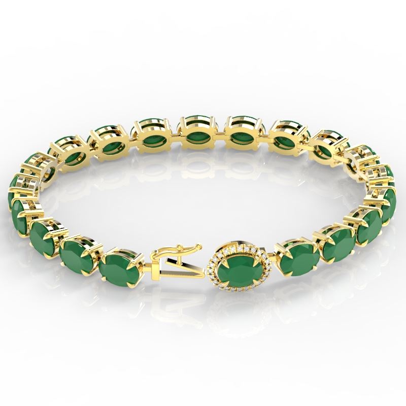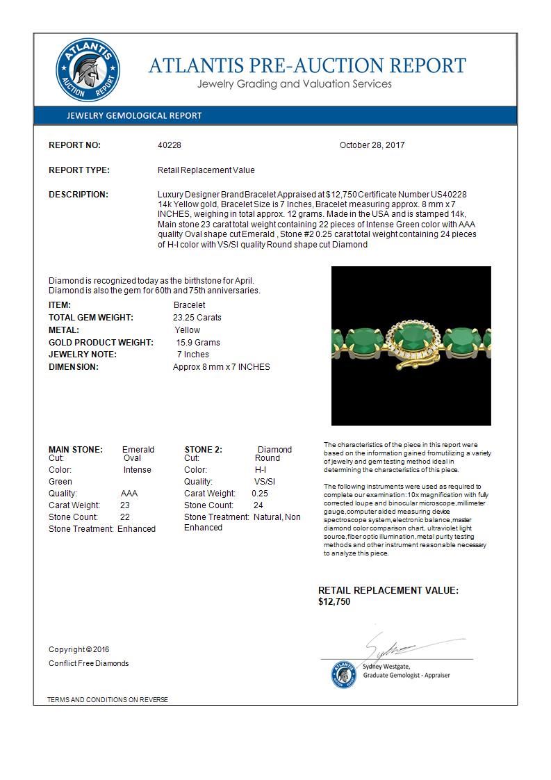 REF-178W2F -40228 ---- 23.25 CTW Emerald & VS/SI Diamond Tennis Micro Pave Halo Bracelet 14K Yellow Gold ---- Luxury Designer Brand Bracelet Appraised at $12,750 Certificate Number US40228 14k Yellow gold, Bracelet Size is 7 Inches, Bracelet measuring approx. 8 mm x 7 INCHES, weighing in total approx. 12 grams. Made in the USA and is stamped 14k, Main stone 23 carat total weight containing 22 pieces of Intense Green color with AAA quality Oval shape cut Emerald , Stone #2 0.25 carat total weight containing 24 pieces of H-I color with VS/SI quality Round shape cut Diamond