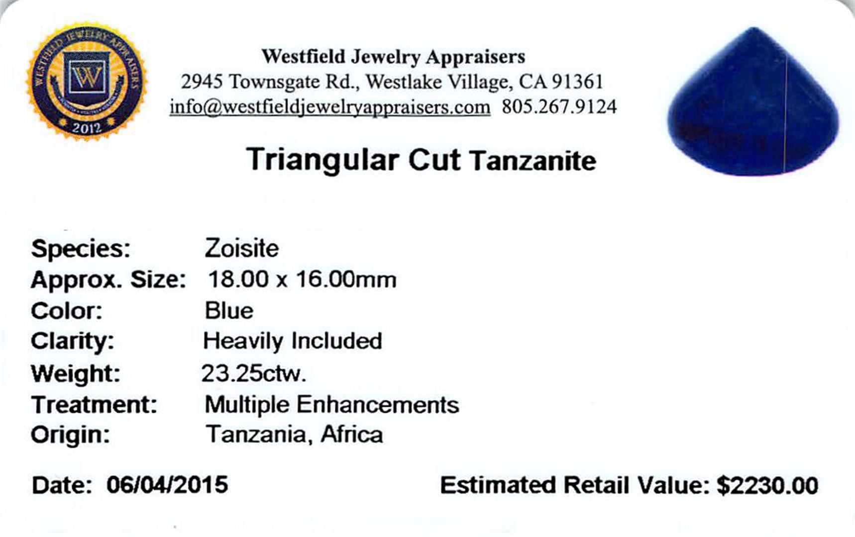One triangle cabochon cut natural tanzanite, measuring 18.00 x 16.00 x 10.00mm, exact weight 23.25ct., clarity is heavily included, type I, dark, very slightly grayish, blue color, (GIA B 7/3), cut is good. Transmitting light somewhat diffusely, transparent to translucent. Naturally occurring internal & external characteristics are present. Indications of heat treatment. Westfield Appraised at $2,230.00.