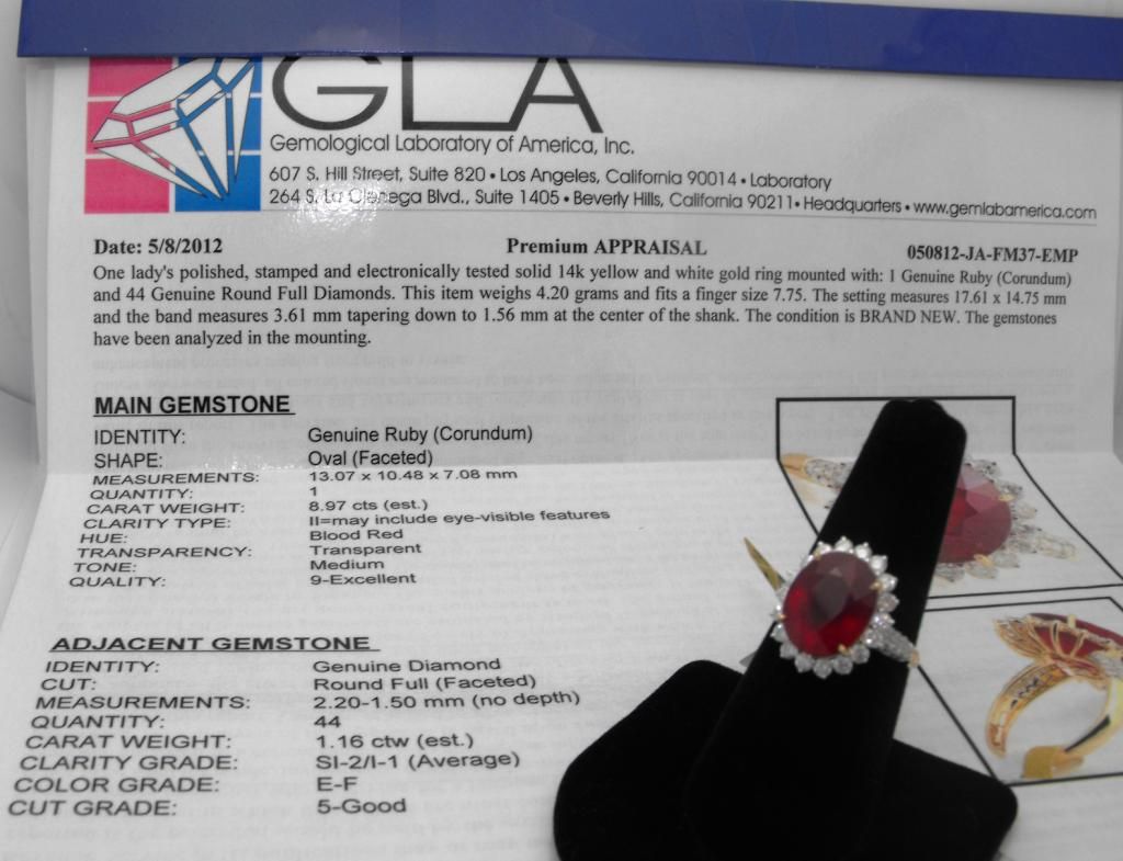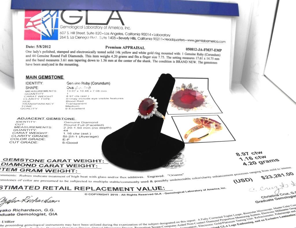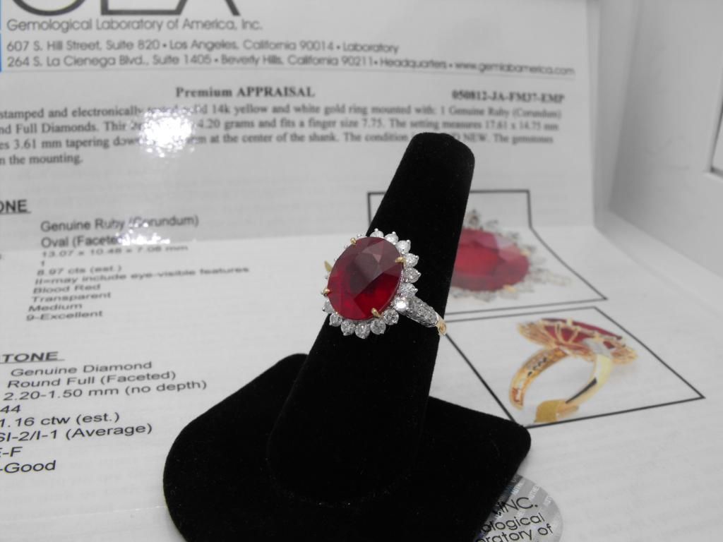 A fabulous8.97 ct ruby center stone set in 14k YG. Surrounded by1.16 tcw diamonds.