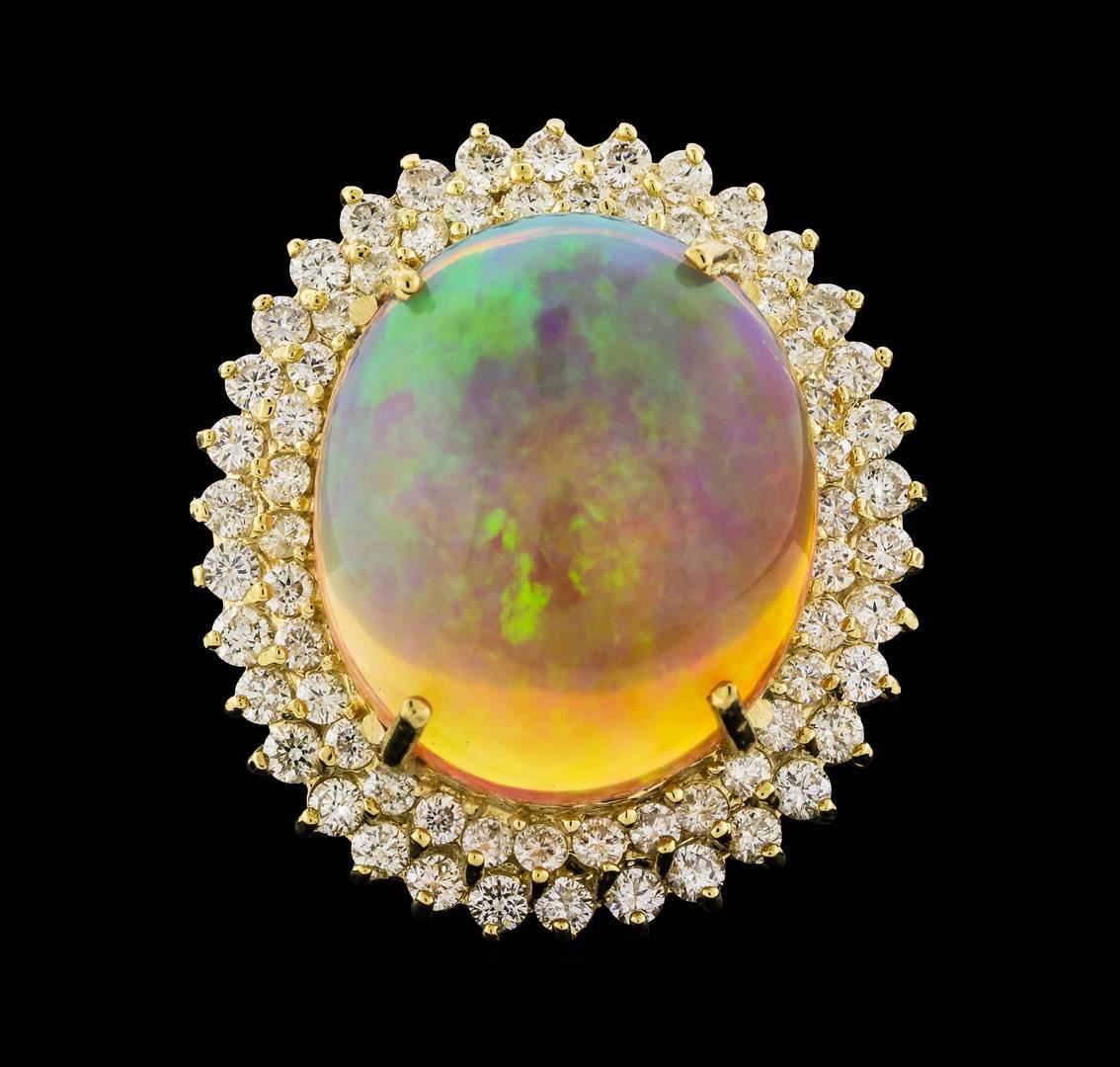 One electronically tested 14KT yellow gold lady's cast fashion ring with a double basket halo with a bright polish finish. The featured lady's ring has a shank measuring 2.66 millimeters wide. Identified with markings of 'K14'. Condition is new, good workmanship. Containing: One orange crystal that is cut in a oval shaped cabochon and is prong set, measuring 23.50 mm long x 19.80 mm wide, and 10.11 mm thick and the approximate weight is 23.36 carats. The opal has a quite bright, red-blue multicolor play of color (fire) in a rolling flashfire pattern; a medium dome; a good cut; no inclusions; slight variation in base in its brightness and pattern; and is slightly directional. Graded in the setting. Thirty-Four prong set round brilliant cut diamonds, measuring 2.40 - 2.35 x 1.45mm (depth est.) approximate total weight of 34 Stones = 1.70ct. Graded in the setting. Clarity SI-1 to SI-3. Color: H - I Cut Good Thirty-Four prong set round brilliant cut diamonds, measuring 2.10 - 2.00 x 1.27mm (depth est.) approximate total weight of 34 Stones = 1.12ct. Graded in the setting. Clarity SI-1 to I-1. Color: G - H Cut Good. Total Weight of Diamonds 2.82ct.. Total Weight of Opals 23.36ct.. Total Weight of Ring 18.70gm. GAS Appraised.