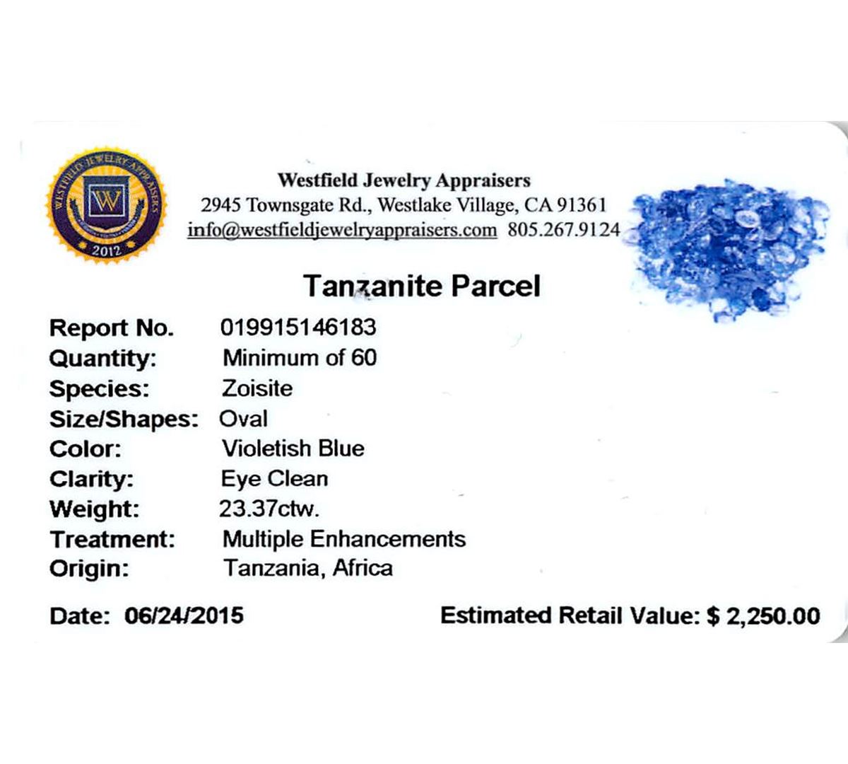 Sixty oval mixed cut natural tanzanites, measuring 4.00 x 3.00 x 2.50mm, exact total weight 23.37ct., clarity is slightly included, type I, medium dark, very slightly grayish, violetish blue color, (GIA vB 6/3), cut is good. Measurements & the color grade are an average for the group, Color grade is an average for the group, Transmitting light with no distortion, transparent, Naturally occurring internal & external characteristics are present, Indications of multiple laboratory enhancements, including high temperature heat treatment. Westfield Appraised at $2,250.00.