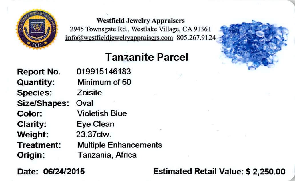 Sixty oval mixed cut natural tanzanites, measuring 4.00 x 3.00 x 2.50mm, exact total weight 23.37ct., clarity is slightly included, type I, medium dark, very slightly grayish, violetish blue color, (GIA vB 6/3), cut is good. Measurements & the color grade are an average for the group, Color grade is an average for the group, Transmitting light with no distortion, transparent, Naturally occurring internal & external characteristics are present, Indications of multiple laboratory enhancements, including high temperature heat treatment. Westfield Appraised at $2,250.00.
