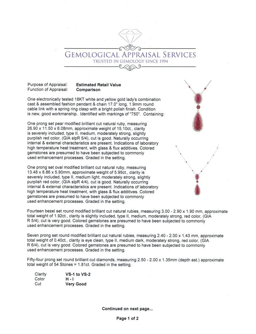 One electronically tested 18KT white and yellow gold lady's combination cast & assembled fashion pendant & chain 17.0" long, 1.9mm round cable link with a spring ring clasp with a bright polish finish. Identified with markings of "750". Condition is new, good workmanship. Containing: One prong set pear modified brilliant cut natural ruby, measuring 26.90 x 11.50 x 6.08mm, approximate weight of 15.10ct., clarity is severely included, type II, medium, moderately strong, slightly purplish red color, (GIA slpR 5/4), cut is good. Naturally occurring internal & external characteristics are present. Indications of laboratory high temperature heat treatment, with glass & flux additives. Colored gemstones are presumed to have been subjected to commonly used enhancement processes. Graded in the setting. One prong set oval modified brilliant cut natural ruby, measuring 13.48 x 8.86 x 5.90mm, approximate weight of 5.95ct., clarity is severely included, type II, medium light, moderately strong, slightly purplish red color, (GIA slpR 4/4), cut is good. Naturally occurring internal & external characteristics are present. Indications of laboratory high temperature heat treatment, with glass & flux additives. Colored gemstones are presumed to have been subjected to commonly used enhancement processes. Graded in the setting. Fourteen bezel set round modified brilliant cut natural rubies, measuring 3.00 - 2.90 x 1.90 mm, approximate total weight of 1.92ct., clarity is slightly included, type II, medium, moderately strong, red color, (GIA R 5/4), cut is very good. Colored gemstones are presumed to have been subjected to commonly used enhancement processes. Graded in the setting. Seven prong set round modified brilliant cut natural rubies, measuring 2.40 - 2.00 x 1.43 mm, approximate total weight of 0.40ct., clarity is eye clean, type II, medium dark, moderately strong, red color, (GIA R 6/4), cut is very good. Colored gemstones are presumed to have been subjected to commonly used enhancement processes. Graded in the setting. Fifty-Four prong set round brilliant cut diamonds, measuring 2.50 - 2.00 x 1.35mm (depth est.) approximate total weight of 54 Stones = 1.81ct. Graded in the setting. Clarity: VS-1 to VS-2. Color: H - I. Cut Very Good. Total Weight of Colored Stones 23.37ct. Total Weight of Diamonds 1.81ct. Total Weight of Pendant & Chain 20.50gm. GAS Appraised at $12,350.00.