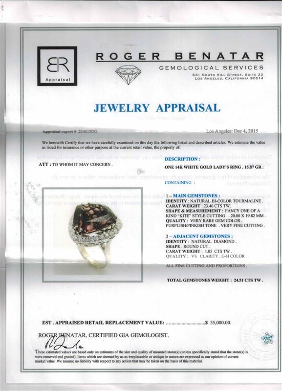 14 K WHITE GOLD BI-COLOR TOURMALINE RING:15.87 grams / BI-COLOR TOURMALINE:23.46ct / Diamond:1.05ct / #GVR1565