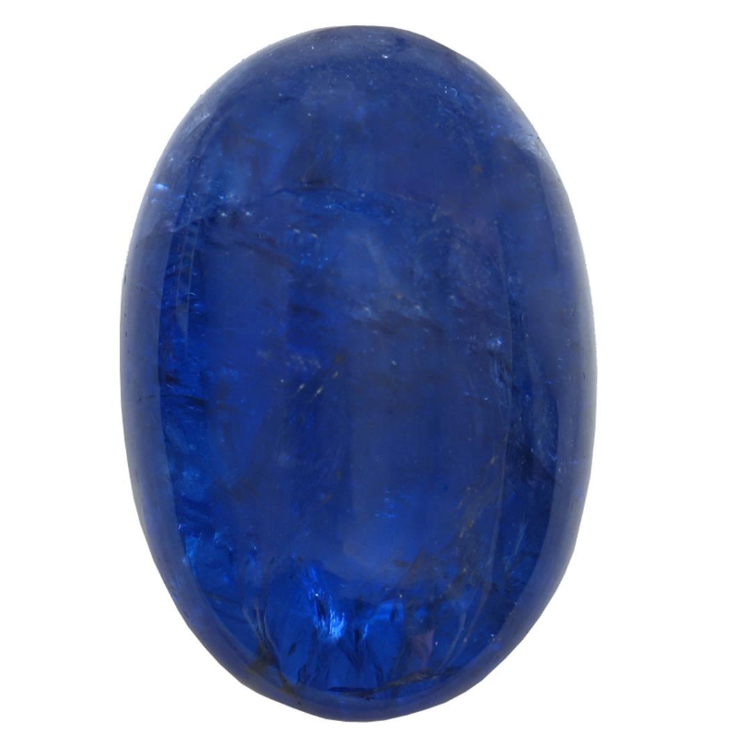 One oval cabochon cut natural tanzanite, measuring 21.50 x 15.00 x 8.00mm, exact weight 23.47ct., clarity is heavily included, type I, dark, moderately strong, blue color, (GIA B 7/4), cut is good. Transmitting light somewhat diffusely, transparent to translucent. Naturally occurring internal & external characteristics are present. Indications of heat treatment. Westfield Appraised at $2,255.00.