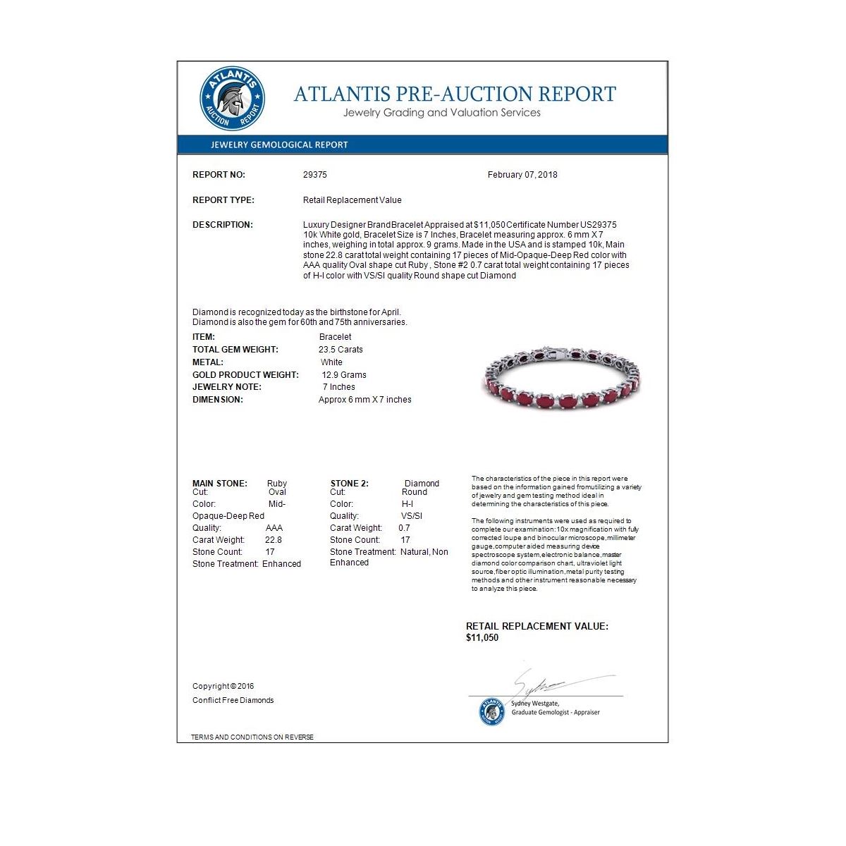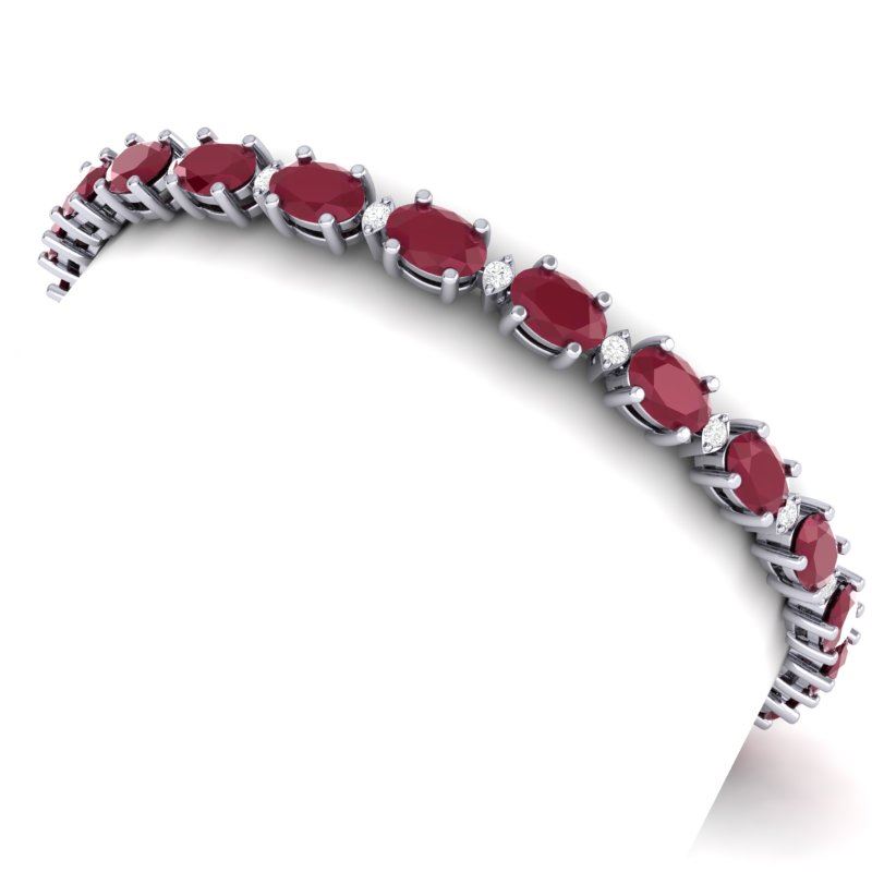 REF-143W6F -29375 ---- 23.5 CTW Ruby & VS/SI Certified Diamond Eternity Bracelet 10K White Gold ---- Luxury Designer Brand Bracelet Appraised at $11,050 Certificate Number US29375 10k White gold, Bracelet Size is 7 Inches, Bracelet measuring approx. 6 mm X 7 inches, weighing in total approx. 9 grams. Made in the USA and is stamped 10k, Main stone 22.8 carat total weight containing 17 pieces of Mid-Opaque-Deep Red color with AAA quality Oval shape cut Ruby , Stone #2 0.7 carat total weight containing 17 pieces of H-I color with VS/SI quality Round shape cut Diamond