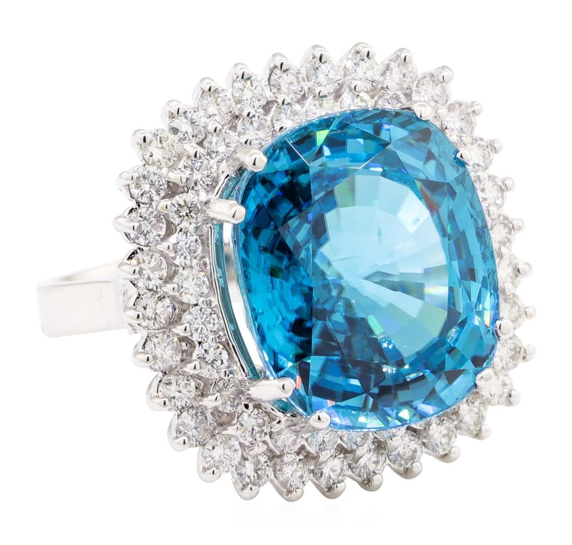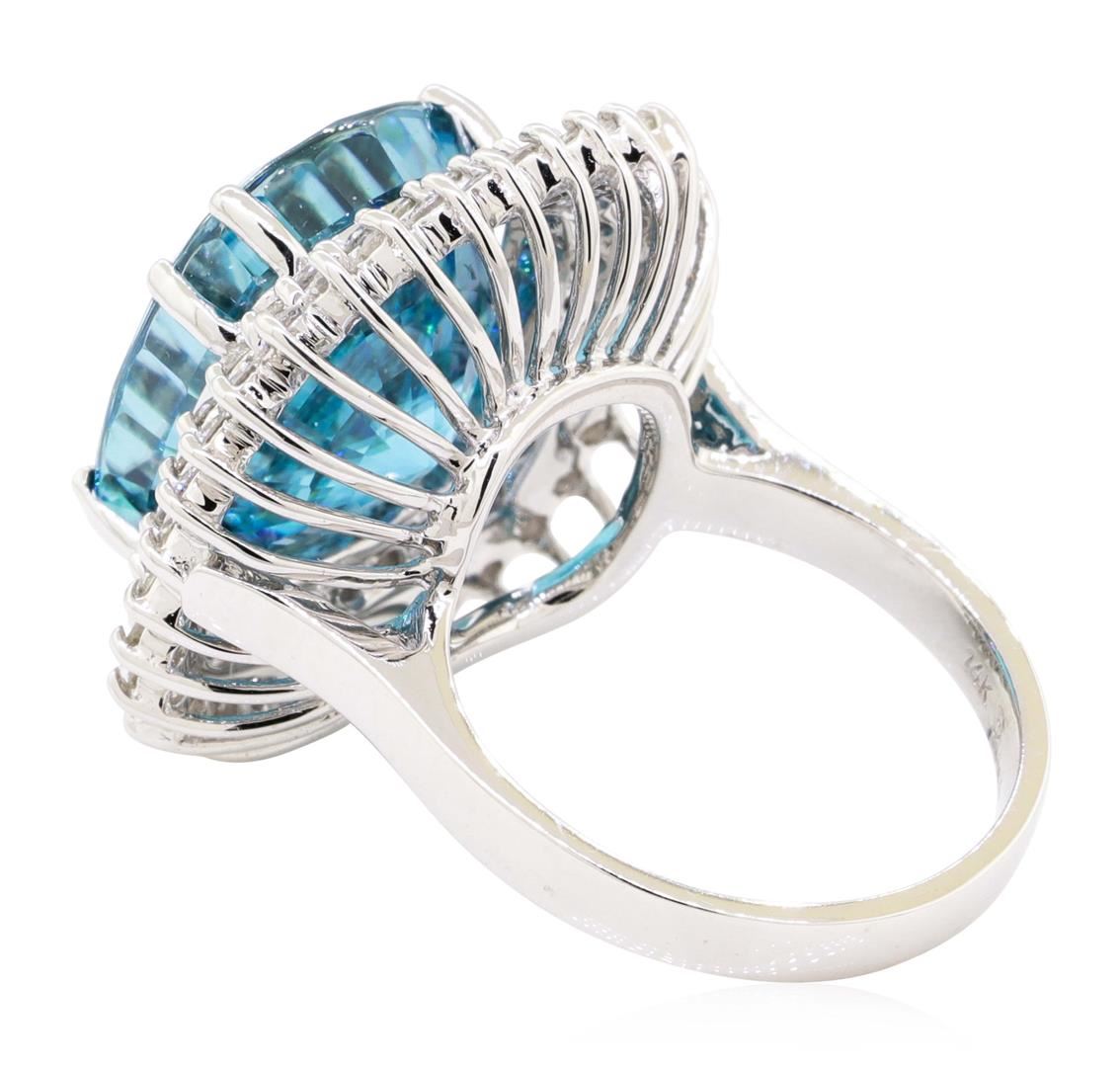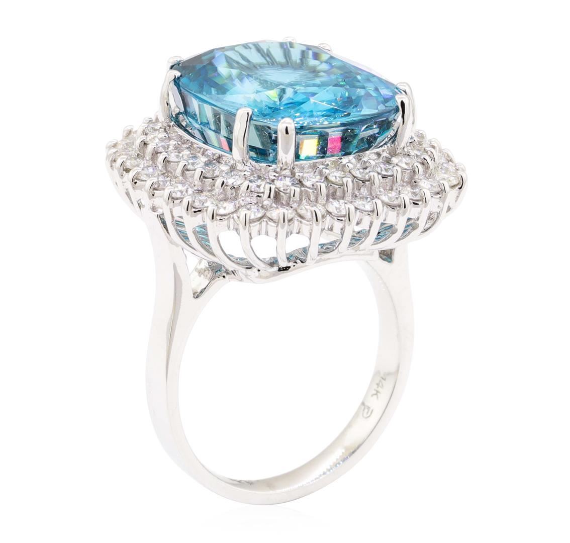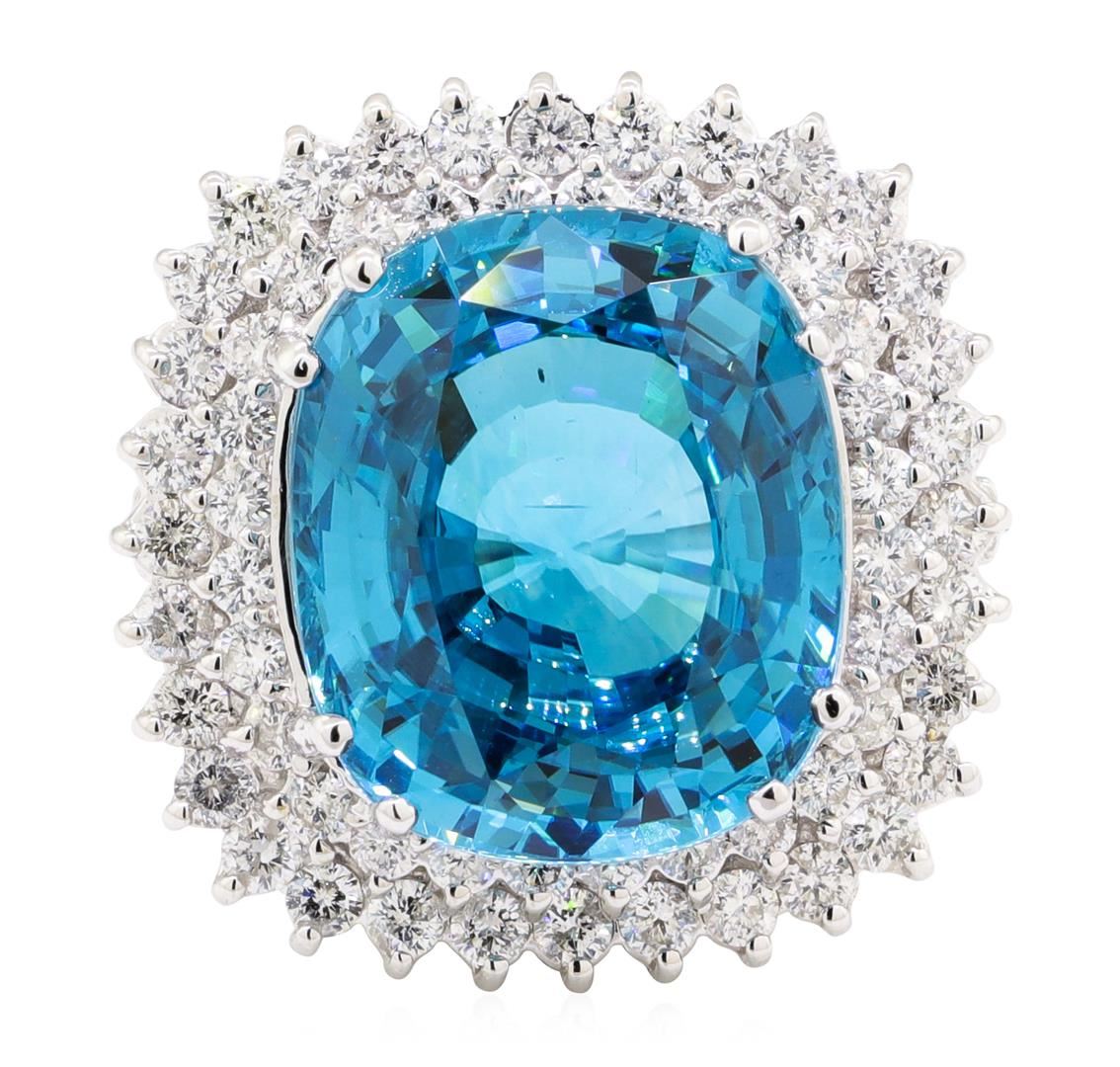One electronically tested 14KT white gold lady's cast fashion ring with a double basket halo with a bright polish finish. The featured lady's ring has a shank measuring 2.60 millimeters wide. Identified with markings of '14K'. Condition is new, good workmanship. Containing: One prong set rectangular cushion modified mixed cut natural blue zircon, measuring 16.11 x 13.56 x 8.56mm, (depth est.) 5%. bulge factor, approximate weight of 22.02ct., clarity is eye clean, medium dark, moderately strong, green blue color, (GIA GB 6/4), cut is excellent. Transmitting light with no distortion, transparent. Colored gemstones are presumed to have been subjected to commonly used enhancement processes. Graded in the setting. Thirty-Two prong set round brilliant cut diamonds, measuring 2.10 - 2.00 x 1.23mm (depth est.) approximate total weight of 32 Stones = 1.00ct. Graded in the setting. Color G - H Clarity SI-1 to SI-2 Cut Good Twenty-Eight prong set round brilliant cut diamonds, measuring 1.70 - 1.65 x 1.01mm (depth est.) approximate total weight of 28 Stones = 0.48ct. Graded in the setting. Color G - H Clarity SI-1 to SI-2 Cut Good. Total Weight of Colored Stones 22.02ct.. Total Weight of Diamonds 1.48ct.. Total Weight of Ring 12.70gm GAS Appraised at $19940.00. GAS Appraised at $19,940.00.