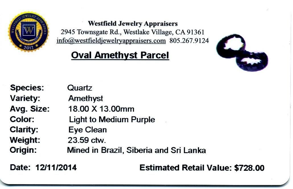 23.59ctw. Oval Amethyst Parcel Westfield Appraised at $728.00.