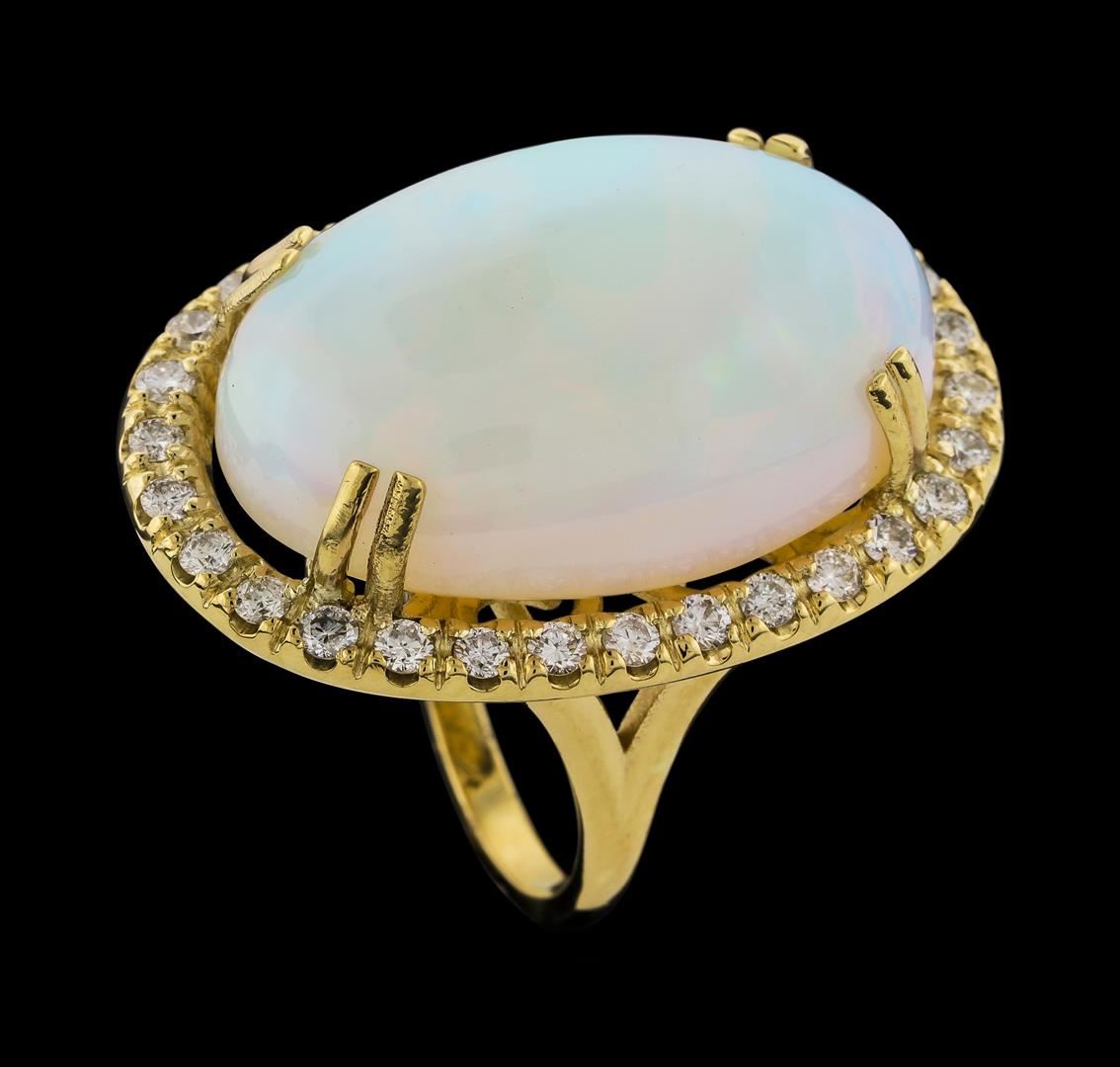 One electronically tested 14KT yellow gold lady's cast fashion ring with a split shank halo with a bright polish finish. The featured lady's ring has a shank measuring 2.12 millimeters wide. Identified with markings of '14K'. Condition is new, good workmanship. Containing: One crystal opal that is cut in a oval shaped cabochon and is prong set, measuring 25.74 mm long x 16.76 mm wide, and 12.36 mm thick and the approximate weight is 23.60 carats. The opal has a somewhat bright, multicolor play of color (fire) in a rolling flashfire pattern; a medium dome; a good cut; no inclusions; slight variation in base in its brightness and pattern; and is slightly directional. Graded in the setting. Thirty prong set round brilliant cut diamonds, measuring 2.10 - 2.00 x 1.27mm (depth est.) approximate total weight of 30 Stones = 0.97ct. Graded in the setting. Clarity SI-1 to SI-2. Color: H - I Cut Good. Total Weight of Diamonds 0.97ct.. Total Weight of Opals 23.60ct.. Total Weight of Ring 14.70gm. GAS Appraised at $9,640.00.