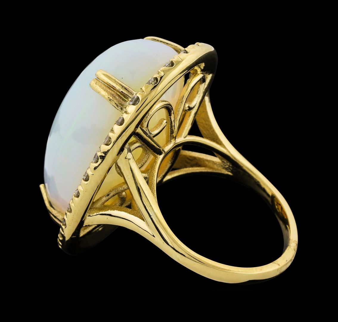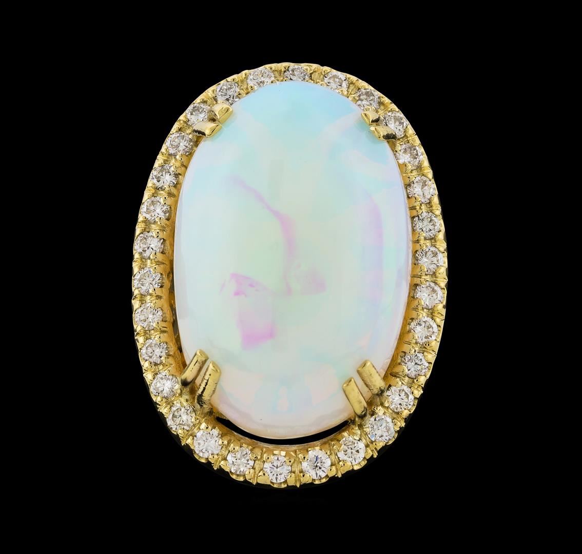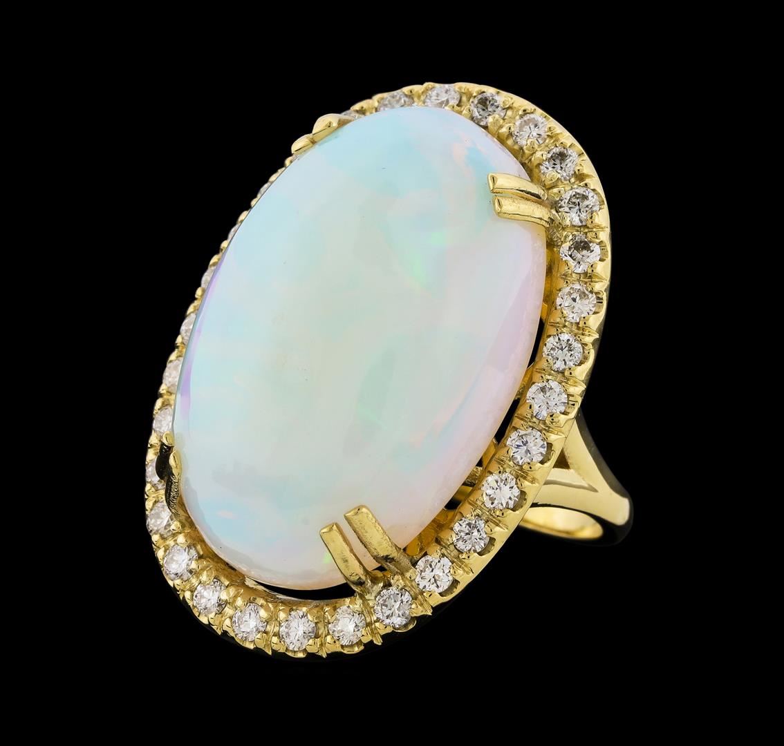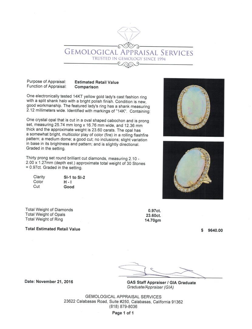 One electronically tested 14KT yellow gold lady's cast fashion ring with a split shank halo with a bright polish finish. The featured lady's ring has a shank measuring 2.12 millimeters wide. Identified with markings of '14K'. Condition is new, good workmanship. Containing: One crystal opal that is cut in a oval shaped cabochon and is prong set, measuring 25.74 mm long x 16.76 mm wide, and 12.36 mm thick and the approximate weight is 23.60 carats. The opal has a somewhat bright, multicolor play of color (fire) in a rolling flashfire pattern; a medium dome; a good cut; no inclusions; slight variation in base in its brightness and pattern; and is slightly directional. Graded in the setting. Thirty prong set round brilliant cut diamonds, measuring 2.10 - 2.00 x 1.27mm (depth est.) approximate total weight of 30 Stones = 0.97ct. Graded in the setting. Clarity SI-1 to SI-2. Color: H - I Cut Good. Total Weight of Diamonds 0.97ct.. Total Weight of Opals 23.60ct.. Total Weight of Ring 14.70gm. GAS Appraised at $9,640.00.