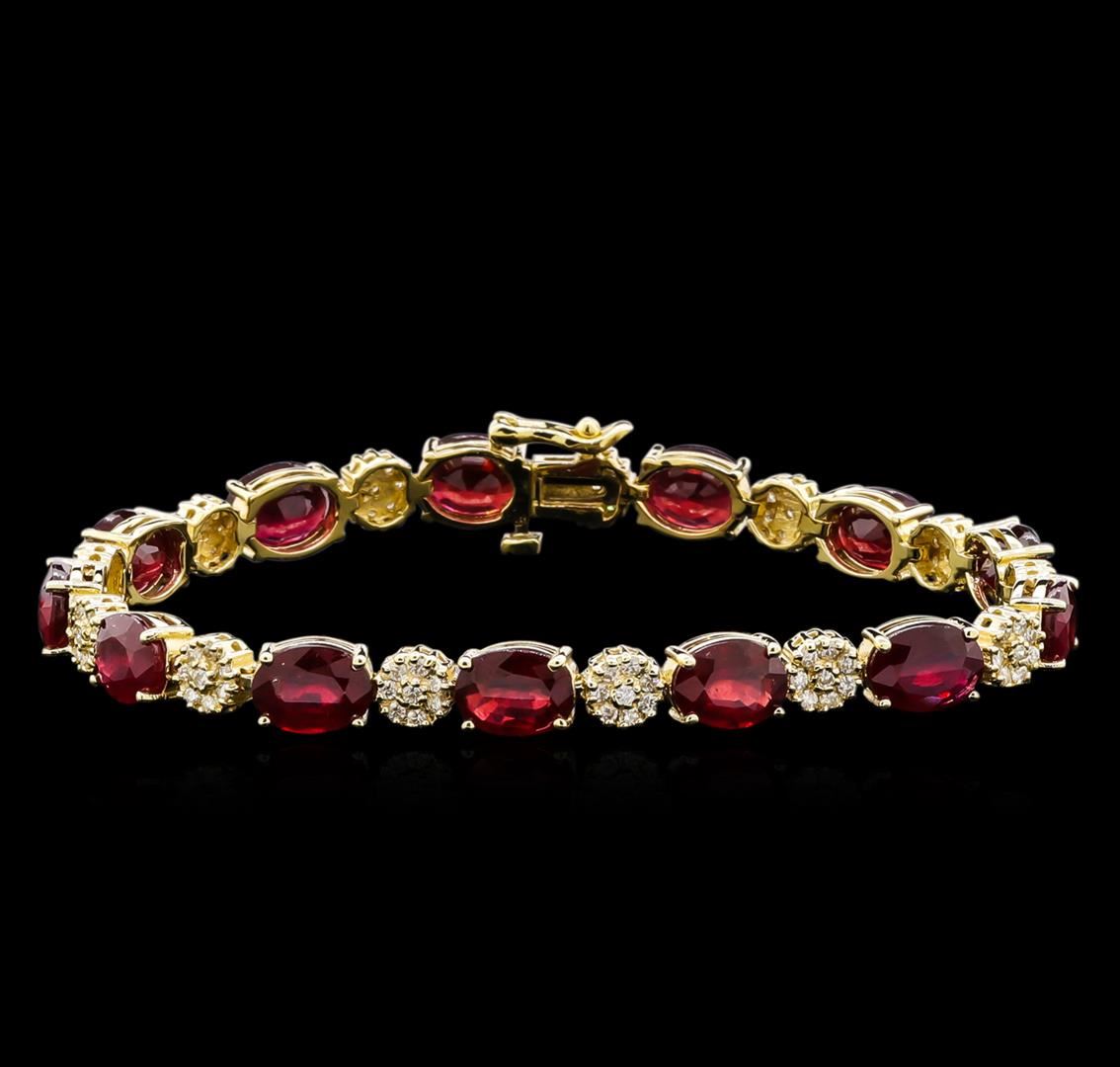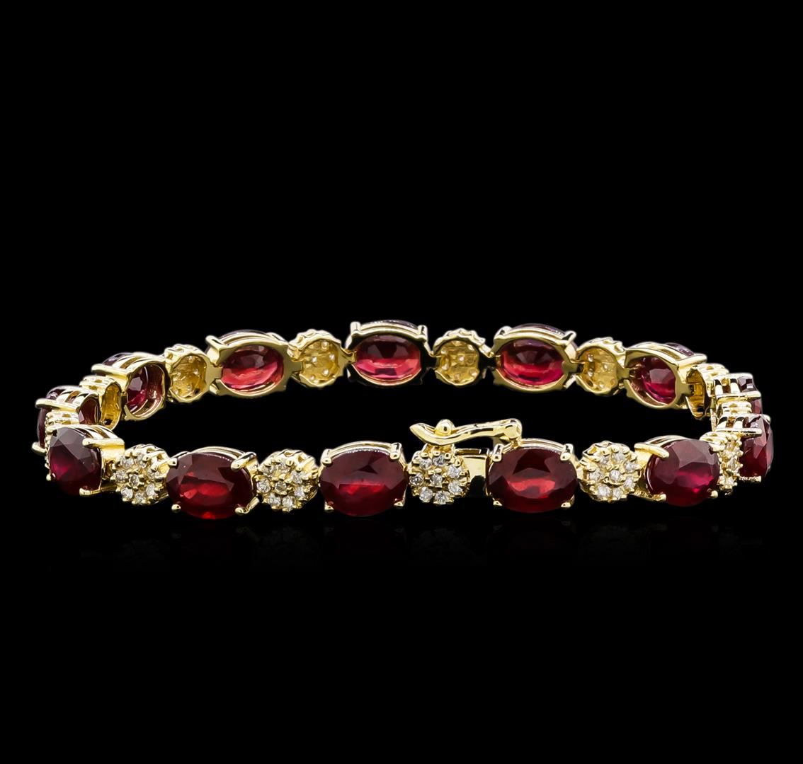 One electronically tested 14KT yellow gold lady's combination cast & assembled fashion bracelet with a tongue clasp with foldover safety with a bright polish finish. The featured lady's bracelet measures approximately 7 inches in length. Identified with markings of "14K". Condition is new, good workmanship. Containing: Thirteen prong set oval modified brilliant cut natural rubies, measuring 8.05 x 6.10 x 4.08mm, 5%. bulge factor, approximate total weight of 23.60ct., clarity is heavily included, type II, medium dark, moderately strong, red color, (GIA R 6/4), cut is good. Naturally occurring internal & external characteristics are present. Indications of laboratory high temperature heat treatment, with glass & flux additives. Colored gemstones are presumed to have been subjected to commonly used enhancement processes. Graded in the setting. One Hundred Four prong set round brilliant cut diamonds, measuring 1.40 - 1.35 x 0.86mm (depth est.) approximate total weight of 104 Stones = 1.02ct. Graded in the setting. Clarity: SI-1 to SI-2. Color: H - I. Cut Good. Total Weight of Colored Stones 23.60ct. Total Weight of Diamonds 1.02ct. Total Weight of Bracelet 16.30gm. GAS Appraised at $13,590.00.