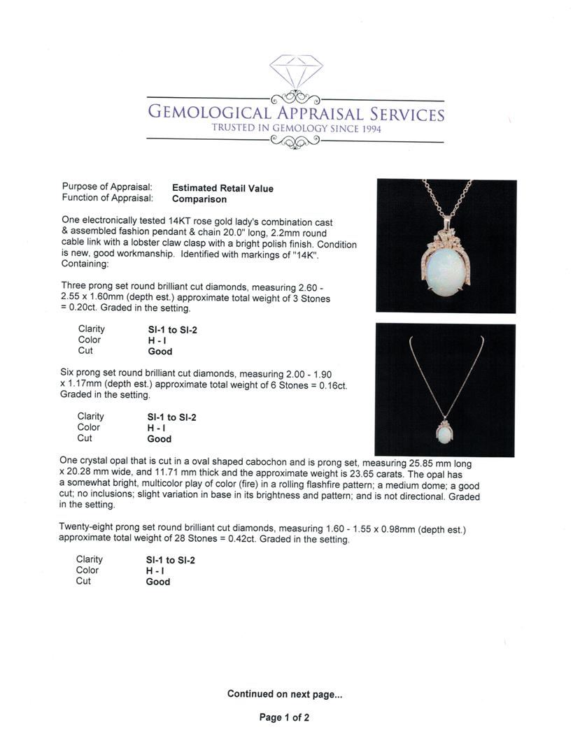 One electronically tested 14KT rose gold lady's combination cast & assembled fashion pendant & chain 20.0" long, 2.2mm round cable link with a lobster claw clasp with a bright polish finish. Identified with markings of "14K". Condition is new, good workmanship. Containing: Three prong set round brilliant cut diamonds, measuring 2.60 - 2.55 x 1.60mm (depth est.) approximate total weight of 3 Stones = 0.20ct. Graded in the setting. Clarity: SI-1 to SI-2. Color: H - I. Cut Good Six prong set round brilliant cut diamonds, measuring 2.00 - 1.90 x 1.17mm (depth est.) approximate total weight of 6 Stones = 0.16ct. Graded in the setting. Clarity: SI-1 to SI-2. Color: H - I. Cut Good One crystal opal that is cut in a oval shaped cabochon and is prong set, measuring 25.85 mm long x 20.28 mm wide, and 11.71 mm thick and the approximate weight is 23.65 carats. The opal has a somewhat bright, multicolor play of color (fire) in a rolling flashfire pattern; a medium dome; a good cut; no inclusions; slight variation in base in its brightness and pattern; and is not directional. Graded in the setting. Twenty-Eight prong set round brilliant cut diamonds, measuring 1.60 - 1.55 x 0.98mm (depth est.) approximate total weight of 28 Stones = 0.42ct. Graded in the setting. Clarity: SI-1 to SI-2. Color: H - I. Cut Good. Total Weight of Diamonds 0.78ct. Total Weight of Opals 23.65ct. Total Weight of Pendant & Chain 20.70gm. GAS Appraised at $9,760.00.