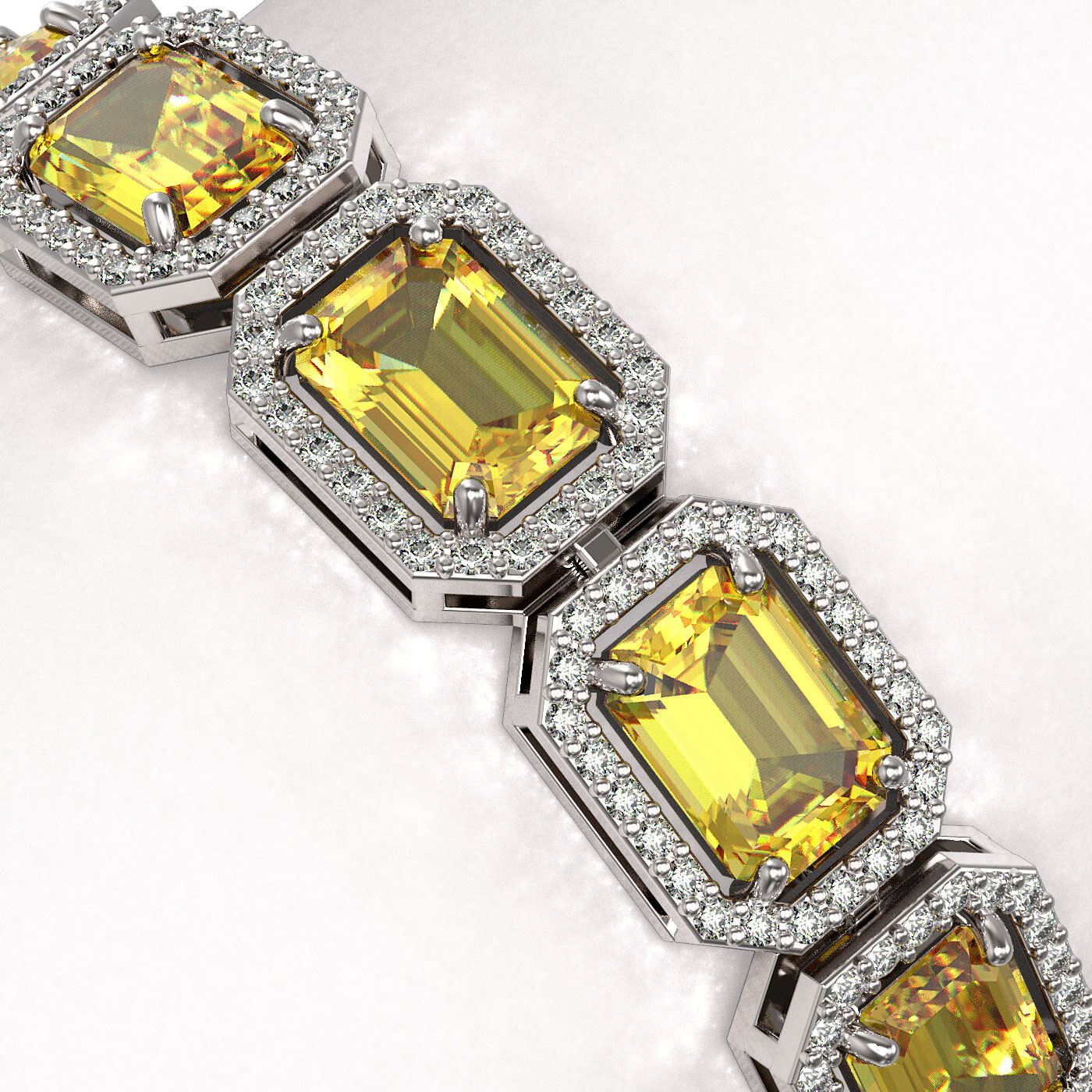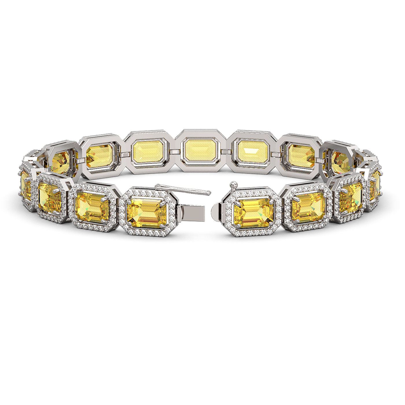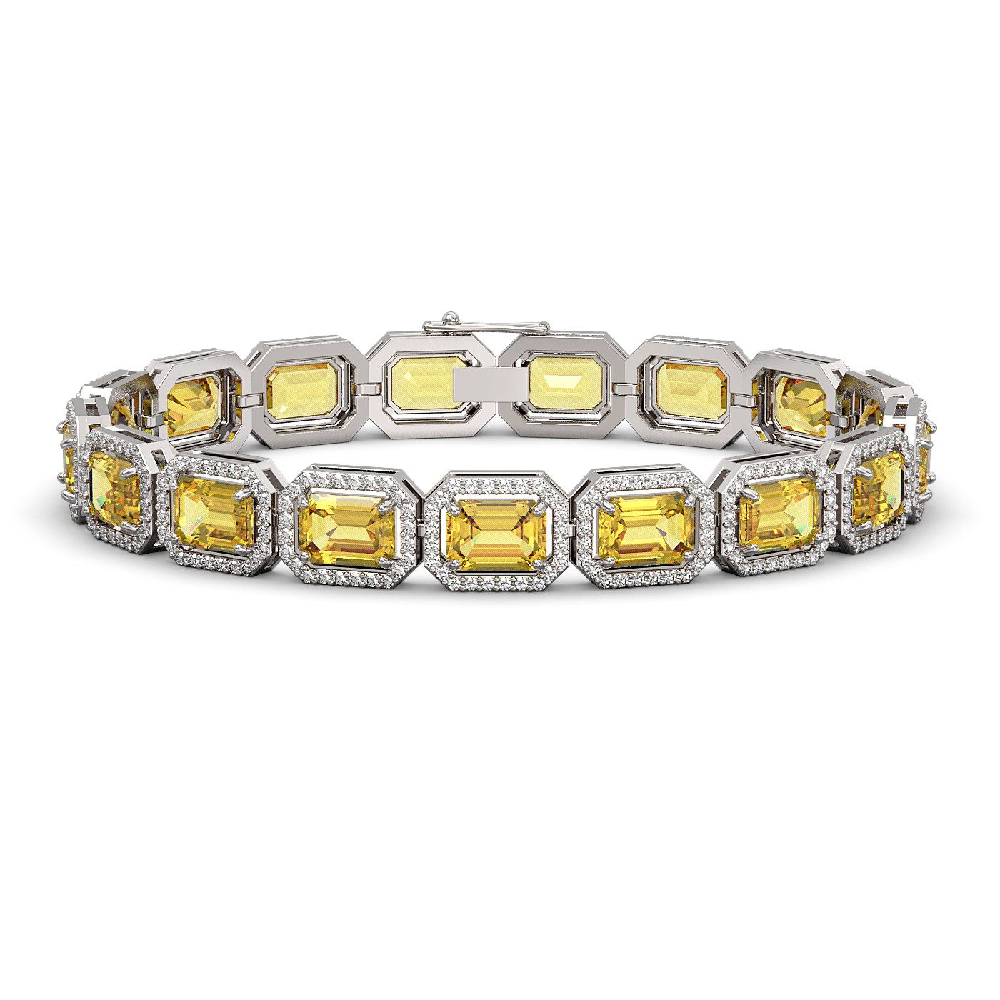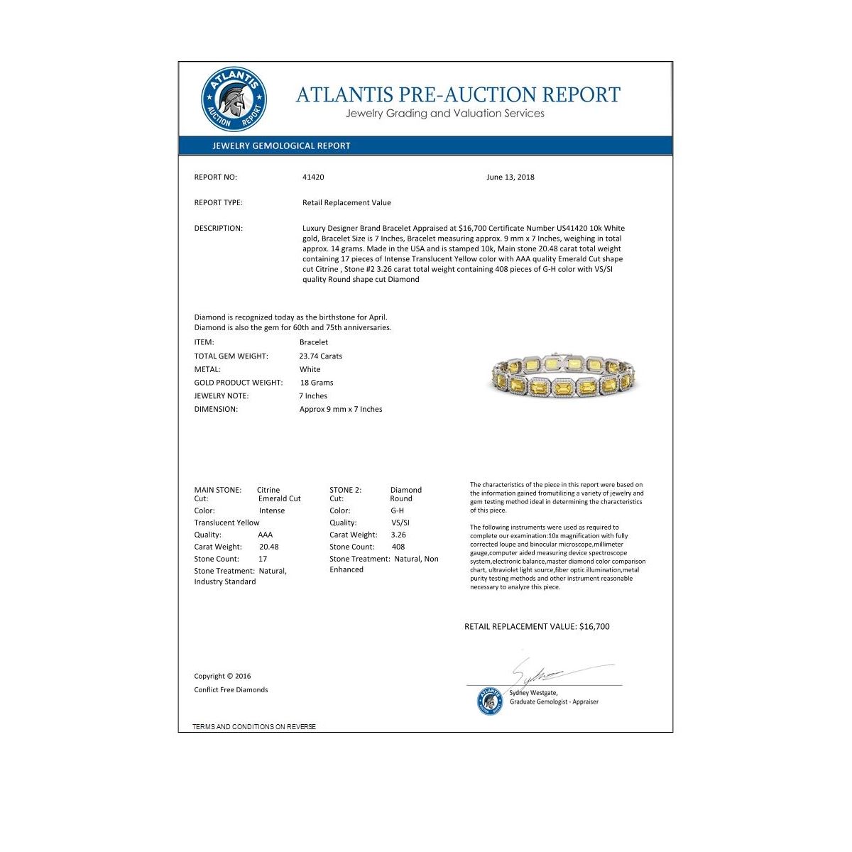 REF-303A8X -41420 ---- 23.74 CTW Fancy Citrine & Diamond Halo Bracelet 10K White Gold ---- Luxury Designer Brand Bracelet Appraised at $16,700 Certificate Number US41420 10k White gold, Bracelet Size is 7 Inches, Bracelet measuring approx. 9 mm x 7 Inches, weighing in total approx. 14 grams. Made in the USA and is stamped 10k, Main stone 20.48 carat total weight containing 17 pieces of Intense Translucent Yellow color with AAA quality Emerald Cut shape cut Citrine , Stone #2 3.26 carat total weight containing 408 pieces of G-H color with VS/SI quality Round shape cut Diamond