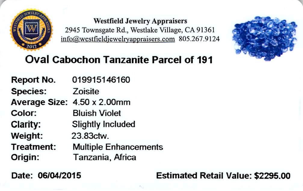 One hundred ninety-one oval mixed cut natural tanzanites, measuring 4.50 x 2.00 x 1.30mm, exact total weight 23.83ct., clarity is slightly included, type I, medium, very slightly grayish, bluish violet color, (GIA bV 5/3), cut is good. Transmitting li Westfield Appraised at $2,295.00.
