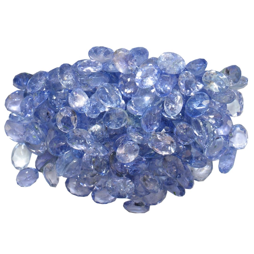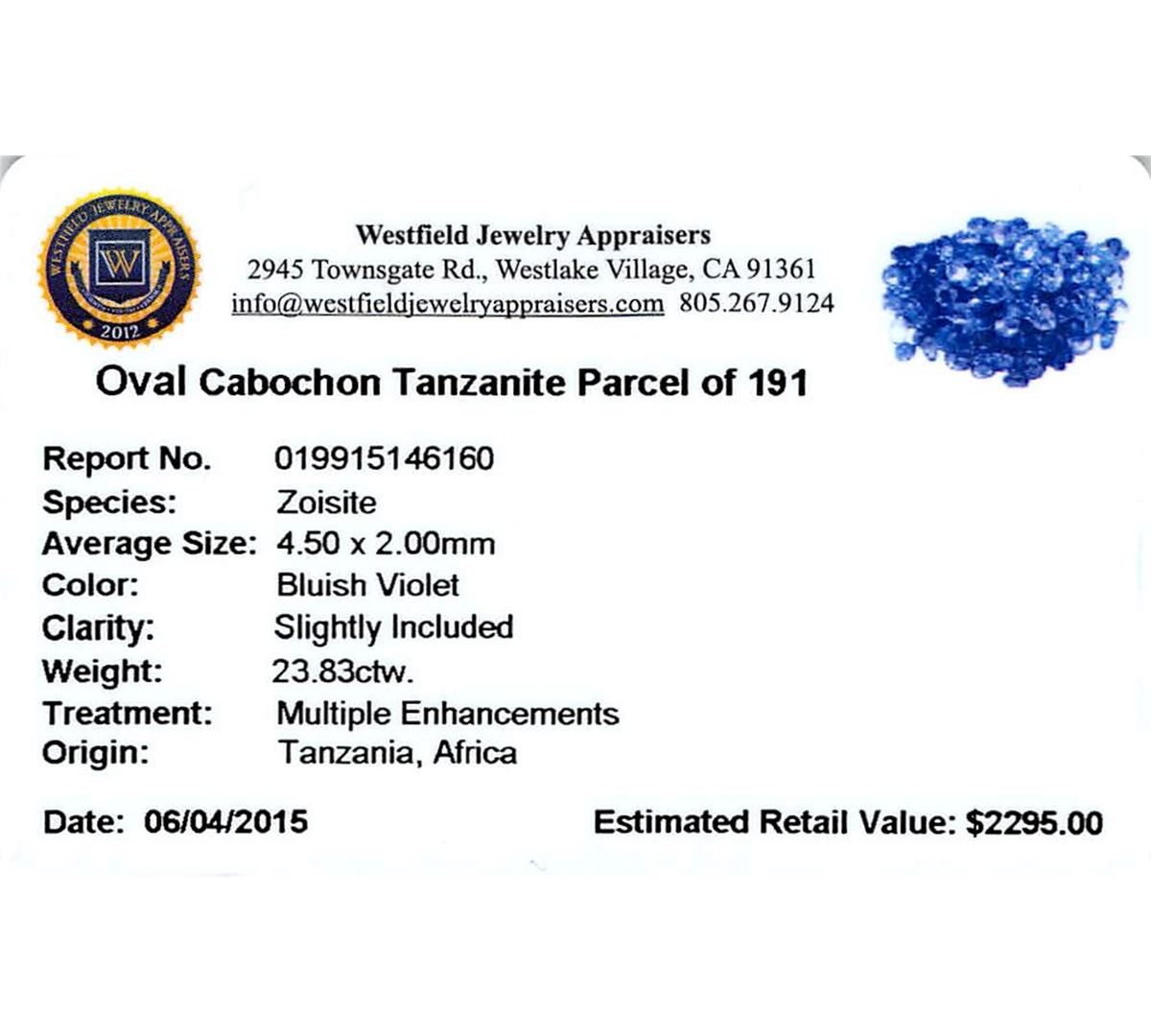 One hundred ninety-one oval mixed cut natural tanzanites, measuring 4.50 x 2.00 x 1.30mm, exact total weight 23.83ct., clarity is slightly included, type I, medium, very slightly grayish, bluish violet color, (GIA bV 5/3), cut is good. Transmitting light with a minimum of distortion, transparent, Naturally occurring internal & external characteristics are present. Measurements & the color grade are an average for the group. Tanzanite is a very rare gemstone that is only found in the country of Tanzania. Originally discovered in 1967. Tiffany & Company, named the stone Tanzanite. It is found in the Usumburu Mountains that border the Umba Valley of northern Tanzania. Tanzanite occurs in gray, brown, violet, blue, reddish-purple, & green. The gem is interesting because of its exceptional pleochroism. Rotated in different directions a tanzanite will exhibit multiple changes of color. Tanzanite has a low tolerance to ultrasonic cleaning, and should not be cleaned using this method. Westfield Appraised at $2,295.00.