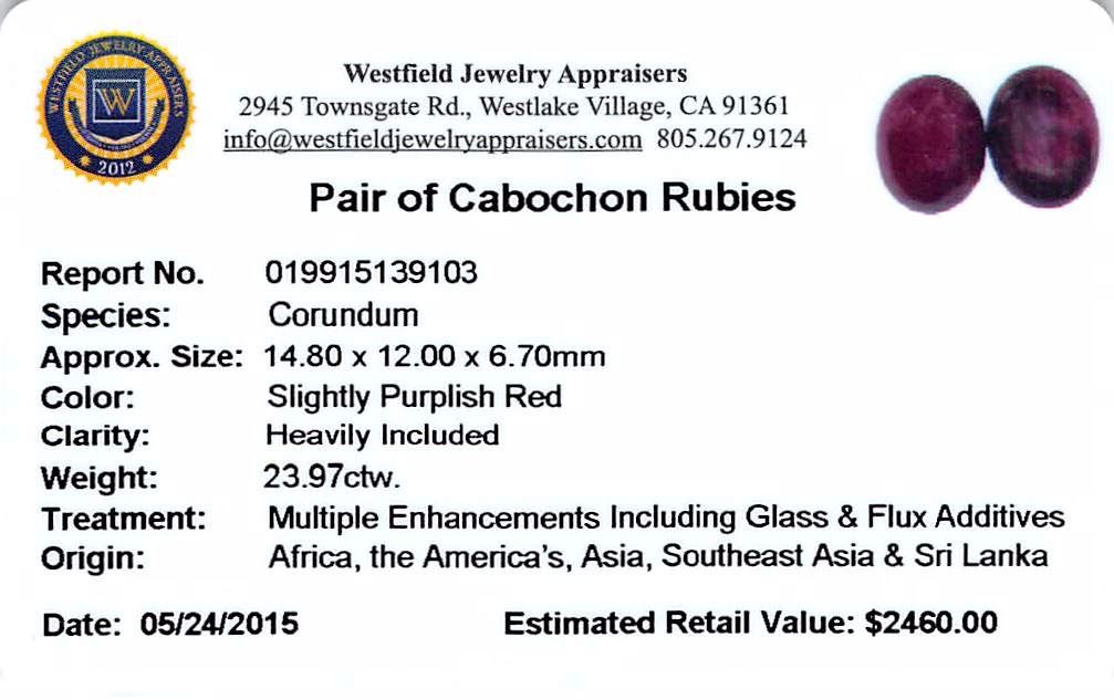 Two oval cabochon cut natural rubies, measuring 14.80 x 12.00 x 6.70mm, exact total weight 23.97ct., clarity is heavily included, type II, dark, very slightly brownish, slightly purplish red color, (GIA slpR 7/3), cut is good. Transmitting light diffusely, opaque. Naturally occurring internal & external characteristics are present. Indications of laboratory high temperature heat treatment, with glass & flux additives. Ruby has a low tolerance to rhodium plating, repolishing the surface, & ultrasonic cleaning. Westfield Appraised at $2,460.00.