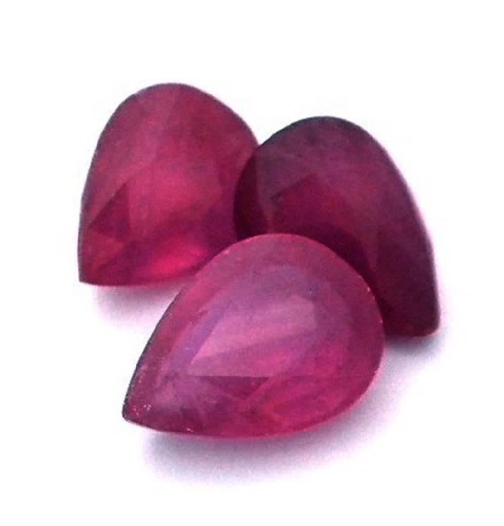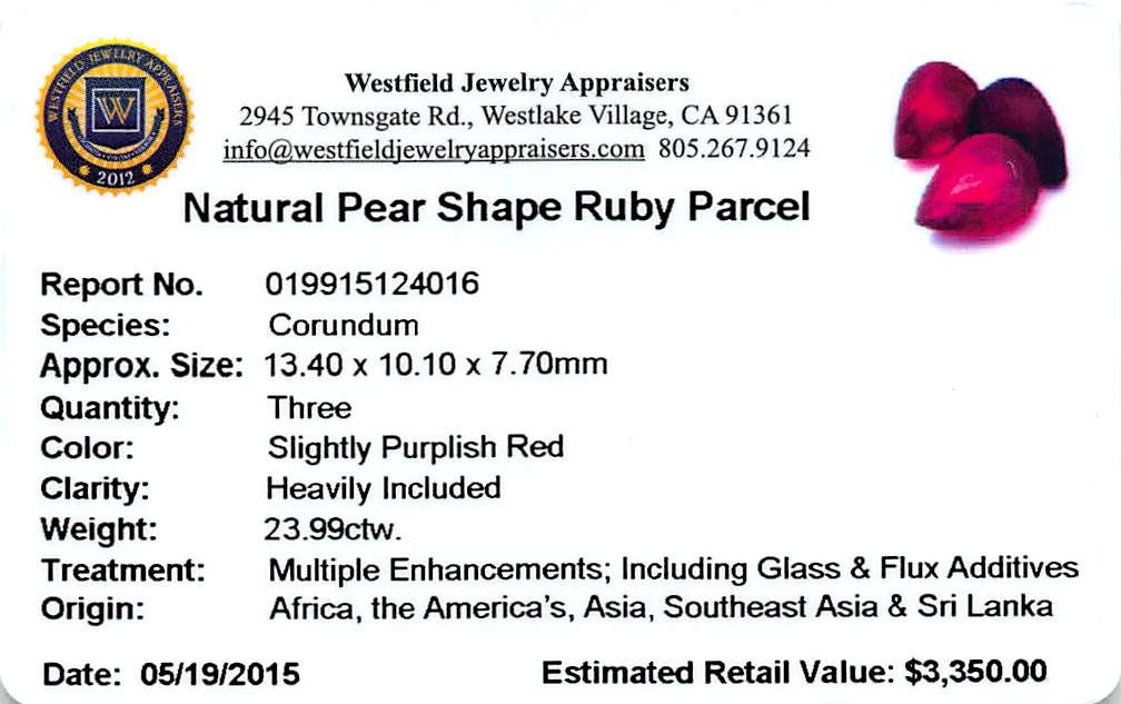 Three pear mixed cut natural rubies, measuring 13.40 x 10.10 x 7.70mm, exact total weight 23.99ct., clarity is heavily included, type II, dark, very slightly brownish, slightly purplish red color, (GIA slpR 7/3), cut is good. Measurements are an average for the group. Transmitting light somewhat diffusely, transparent to translucent. Naturally occurring internal & external characteristics are present. Indications of laboratory high temperature heat treatment, with glass & flux additives. Westfield Appraised at $3,350.00.