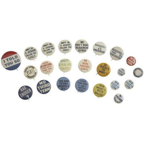 <B>Large Lot of 23 Anti-Franklin Roosevelt Political Buttons.</B></I> Various sizes. The largest button is 1 3/4” and the smallest 3/4”. Most near fine or better.<BR><BR><b>Shipping:</b> Miscellaneous Collectibles, Smal (<a target="_blank" href="http://www.heritageauctions.com/common/shipping.php">view shipping information</a>)