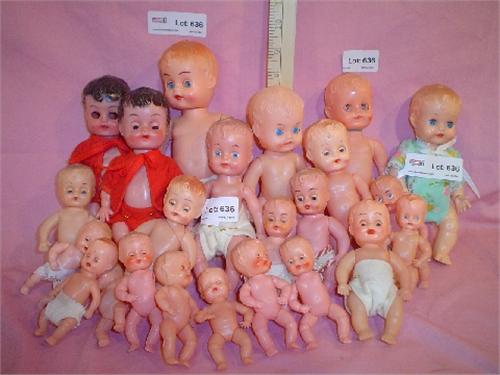 23 Plastic/Hard Rubber Small/Tiny Boy Dolls. Marked: Hong Kong, Blue Box, Red Box, Plasty WG? (Some need work on eyes/one is missing arm)