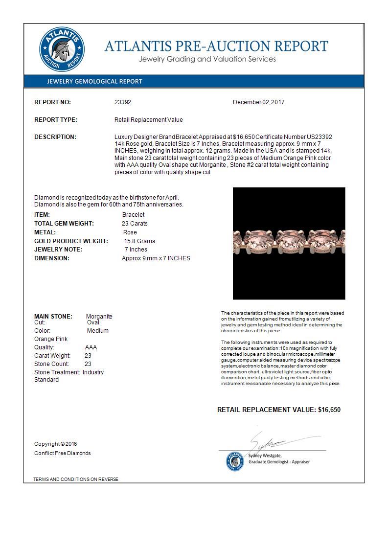 REF-232X8T -23392 ---- 23 CTW Morgaite Eternity Designer Inspired Tennis Bracelet 14K Rose Gold ---- Luxury Designer Brand Bracelet Appraised at $16,650 Certificate Number US23392 14k Rose gold, Bracelet Size is 7 Inches, Bracelet measuring approx. 9 mm x 7 INCHES, weighing in total approx. 12 grams. Made in the USA and is stamped 14k, Main stone 23 carat total weight containing 23 pieces of Medium Orange Pink color with AAA quality Oval shape cut Morganite , Stone #2 carat total weight containing pieces of color with quality shape cut