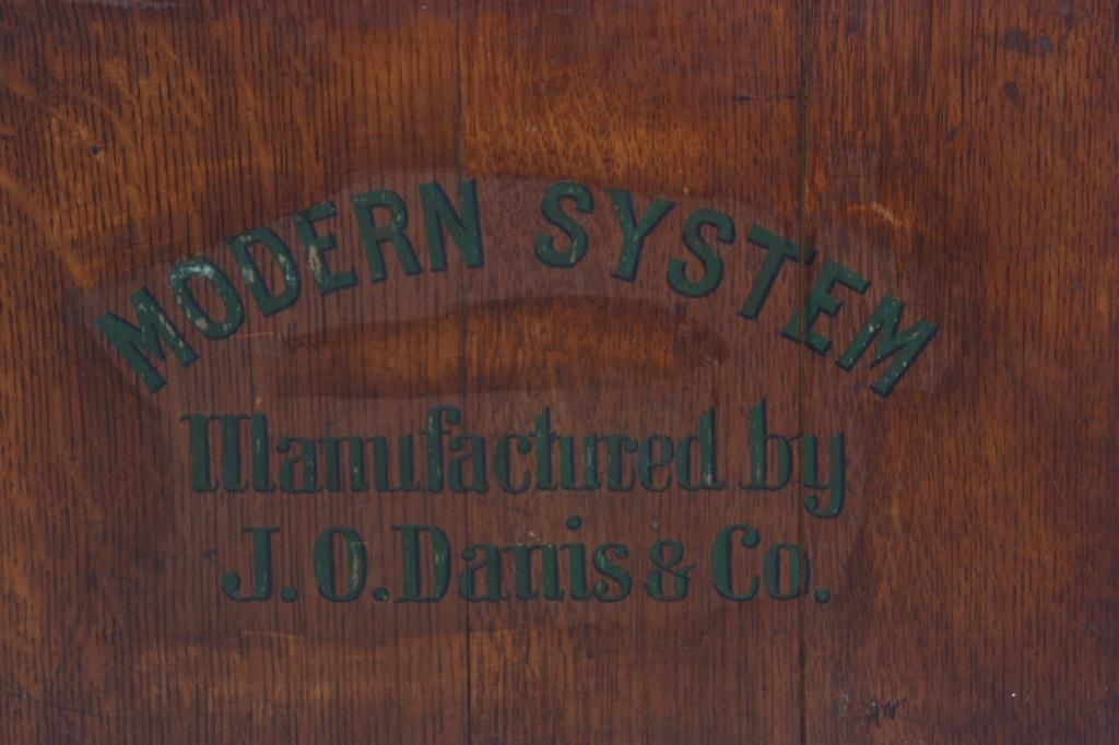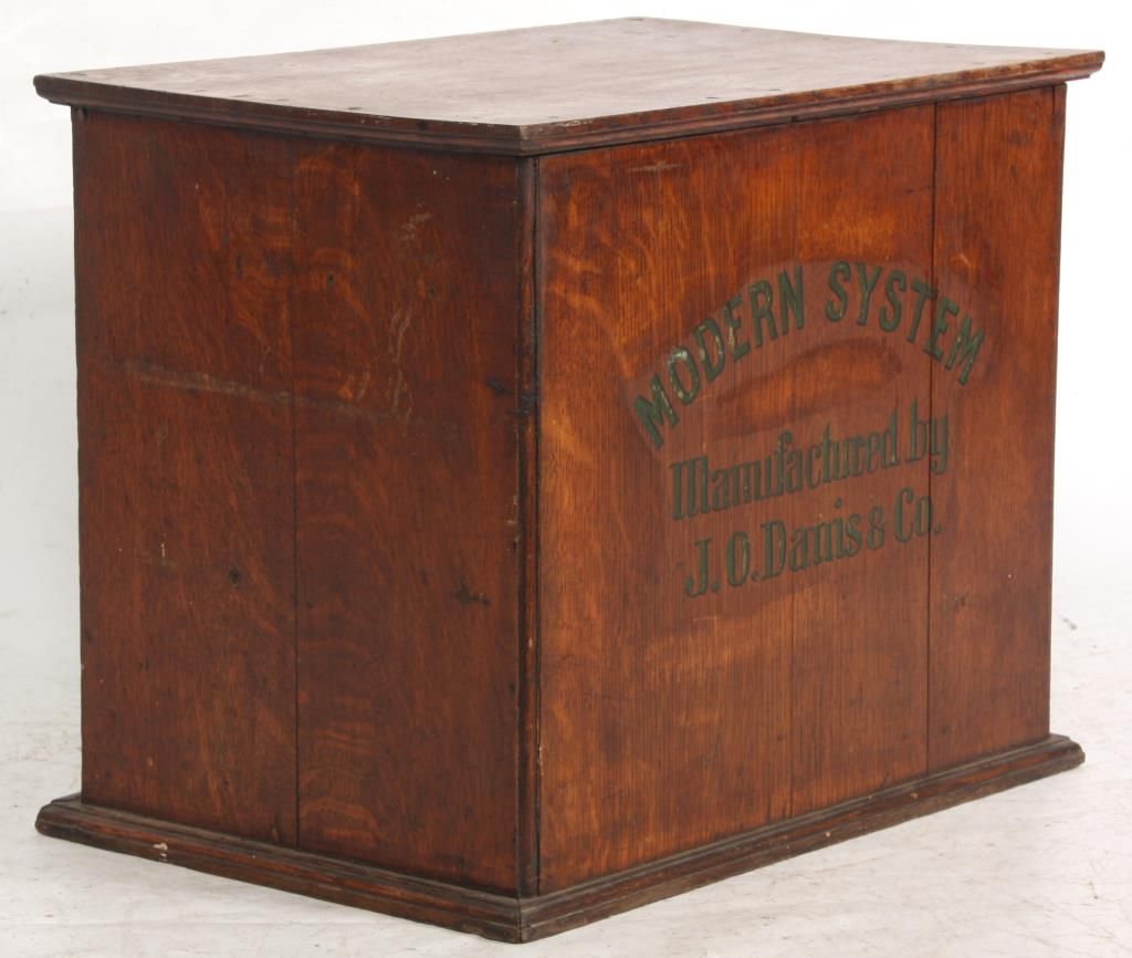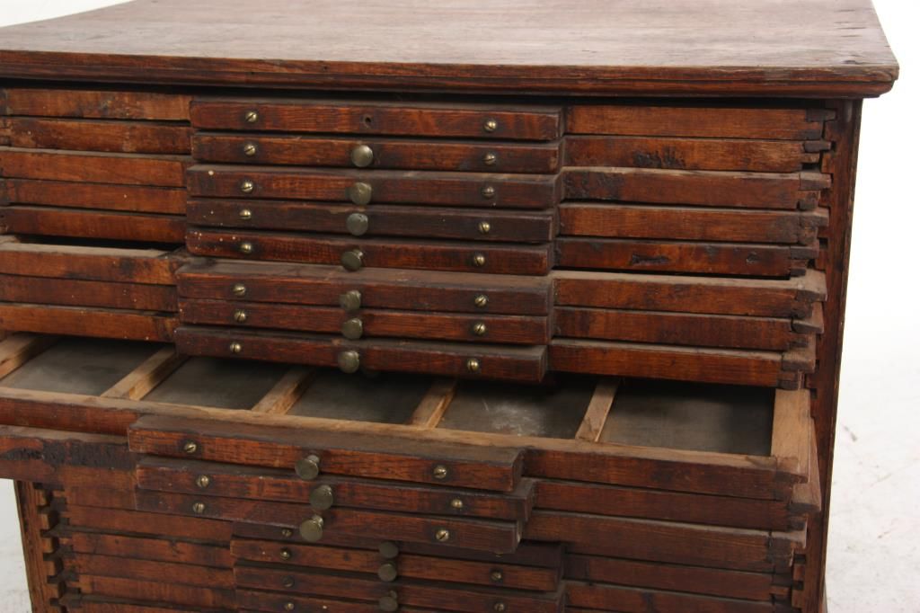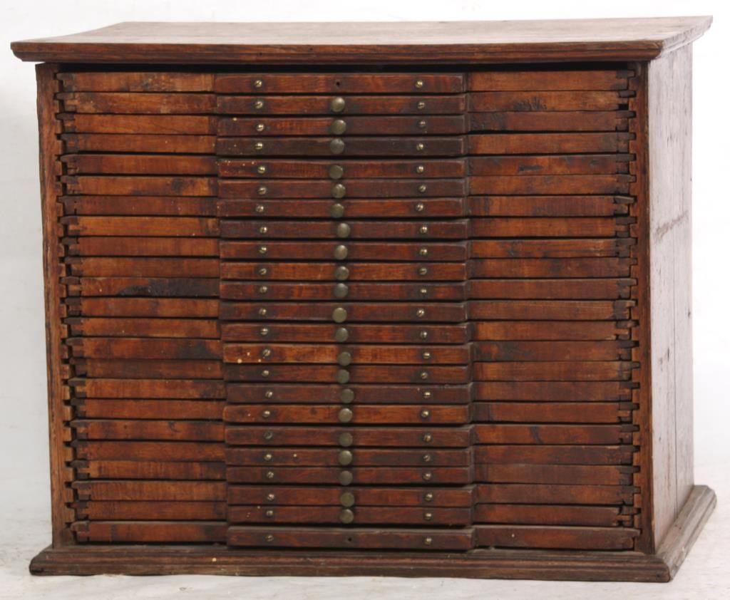 23 Drawer Oak Typesetter Cabinet. Oak case has 23 drawers with a block front design and turned brass pulls; the cabinet is missing it’s front doors. Worn and used condition, overcoated original finish; green lettering on the front of the box reads “Modern System, Manufactured by J.O. Danis & Co.”. 18 in. high x 22.5 in. wide x 15 in. deep.