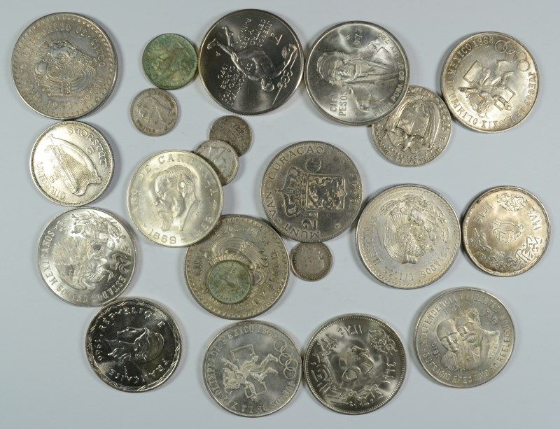 ( 23 ) FOREIGN SILVER COINS MOSTLY LARGER COINS, COINS WEIGH OVER 395g