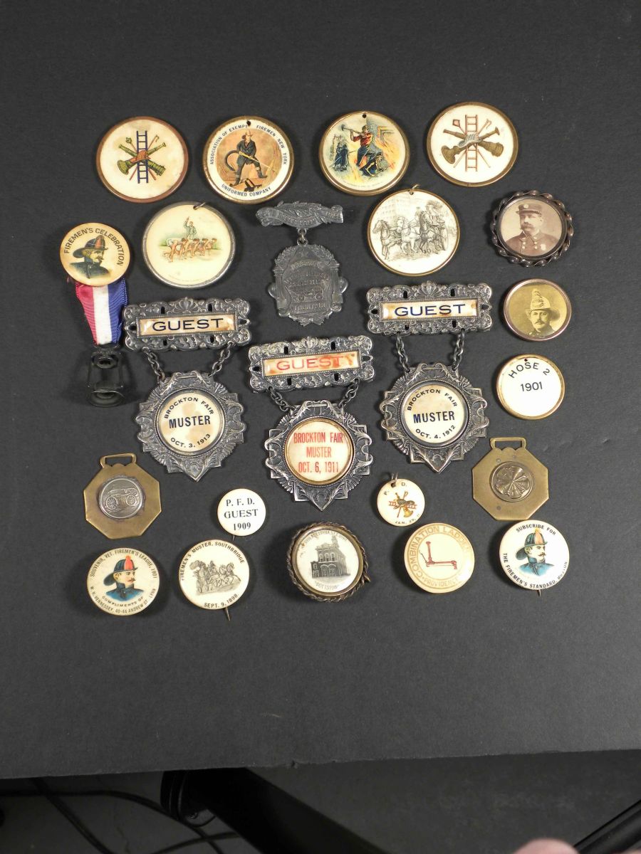 Lot of 23 Firemen's Items, including celluloid pins, watch fobs and badges. Various sizes and conditions.