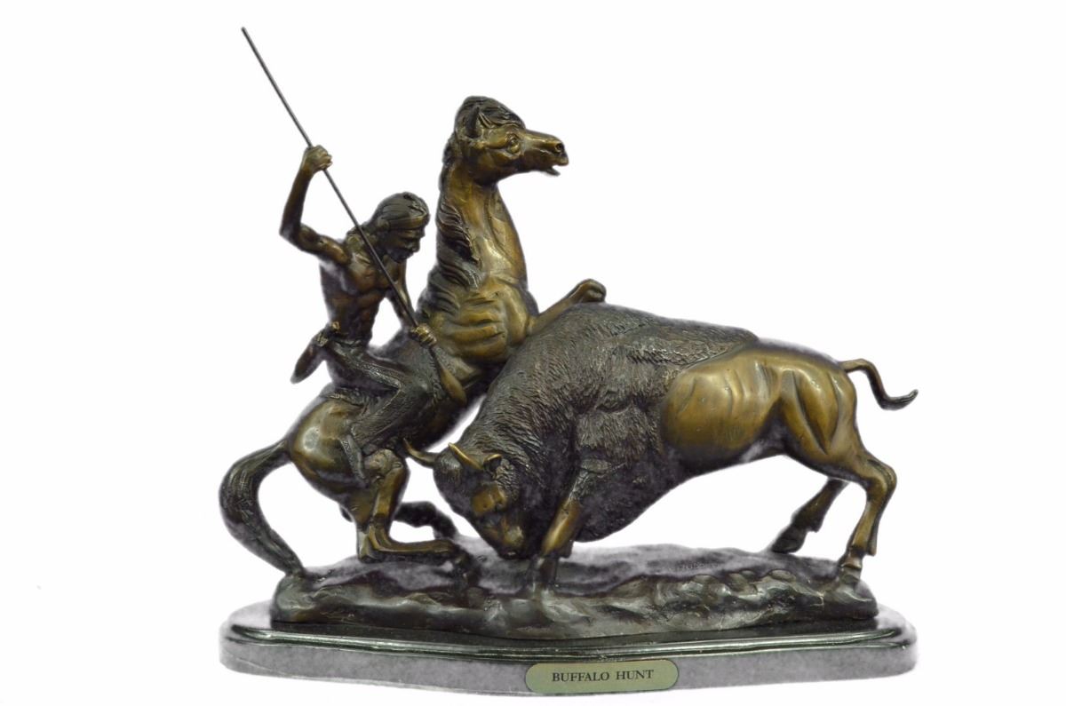 This Amazing Sculpture Is Of A Native American Hunter On His Horse Slaying A Buffalo With A Spear. He Sits Firmly On His Trusted Horse As It Rears Itself Up And Draws Back His Strong Arms That Hold His Spear. He Is Wearing An Elaborate Headband With Feathers From It Covering The Top Of His Head, A Tooth Necklace, Pants With Tassels And Beautiful Embroidery Down The Leg And Moccasins. His Hair Is Braided Thickly Down His Back And On His Belt He Holds A Knife He Crafted To De-Skin His Prey. He Respects The Animal And Will Use Every Part Of It To Provide His Town’S People With Clothing, Meat And Making Use Of Everything From Its Body. He Lifts Up A Long Spear He Made Specifically To Hunt The Buffalo And Raises It Above The Head Of The Beast. It Has Charged In His Direction And Caused His Horse To Rear Up, Giving Him An Advantage Angle To Take The Buffalo’S Life In One Quick Motion. Although The Warrior Is In An Intimidating Situation He Remains Calm And Confident Which Reflects In His Face. He Is A Healthy Middle Aged Man That Is Experienced In Hunting And Weaponry And Trusted To Be One Of A Few Sent To Bring The Buffalo. Handmade Of 100% Bronze And Cast Using The Ancient “Lost Wax Method”. Bronze Dimensions With Marble Base: Height 13 X Width 18 inches. Weight: 23 Lbs.