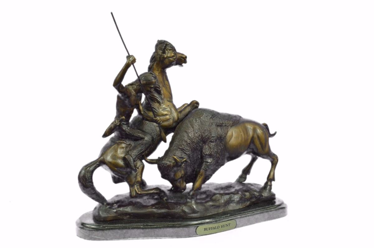 This Amazing Sculpture Is Of A Native American Hunter On His Horse Slaying A Buffalo With A Spear. He Sits Firmly On His Trusted Horse As It Rears Itself Up And Draws Back His Strong Arms That Hold His Spear. He Is Wearing An Elaborate Headband With Feathers From It Covering The Top Of His Head, A Tooth Necklace, Pants With Tassels And Beautiful Embroidery Down The Leg And Moccasins. His Hair Is Braided Thickly Down His Back And On His Belt He Holds A Knife He Crafted To De-Skin His Prey. He Respects The Animal And Will Use Every Part Of It To Provide His Town’S People With Clothing, Meat And Making Use Of Everything From Its Body. He Lifts Up A Long Spear He Made Specifically To Hunt The Buffalo And Raises It Above The Head Of The Beast. It Has Charged In His Direction And Caused His Horse To Rear Up, Giving Him An Advantage Angle To Take The Buffalo’S Life In One Quick Motion. Although The Warrior Is In An Intimidating Situation He Remains Calm And Confident Which Reflects In His Face. He Is A Healthy Middle Aged Man That Is Experienced In Hunting And Weaponry And Trusted To Be One Of A Few Sent To Bring The Buffalo. Handmade Of 100% Bronze And Cast Using The Ancient “Lost Wax Method”. Bronze Dimensions With Marble Base: Height 13 X Width 18 inches. Weight: 23 Lbs. This Is Not An Original Of His Work But A Recent Reproduction.