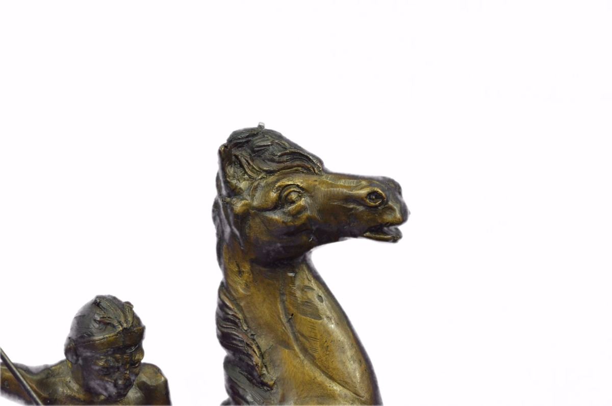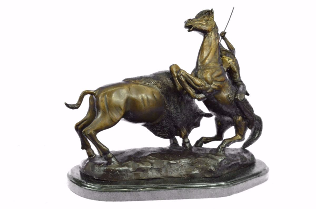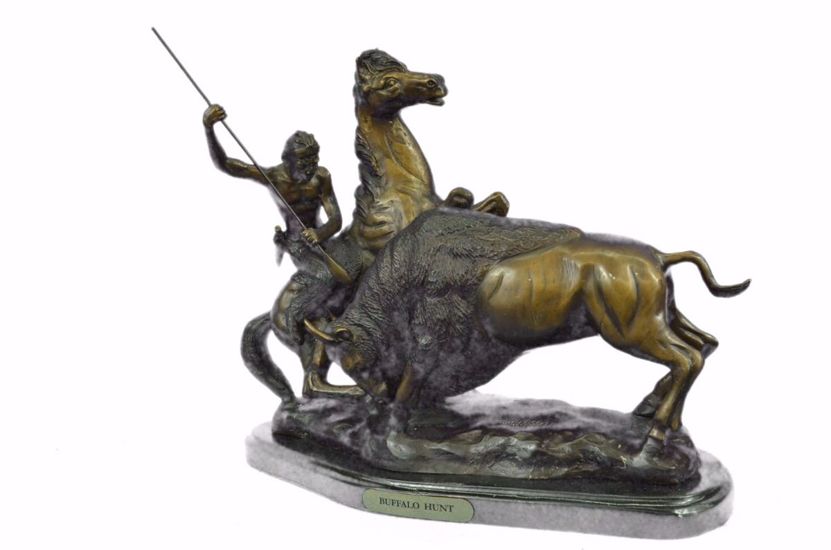 This Amazing Sculpture Is Of A Native American Hunter On His Horse Slaying A Buffalo With A Spear. He Sits Firmly On His Trusted Horse As It Rears Itself Up And Draws Back His Strong Arms That Hold His Spear. He Is Wearing An Elaborate Headband With Feathers From It Covering The Top Of His Head, A Tooth Necklace, Pants With Tassels And Beautiful Embroidery Down The Leg And Moccasins. His Hair Is Braided Thickly Down His Back And On His Belt He Holds A Knife He Crafted To De-Skin His Prey. He Respects The Animal And Will Use Every Part Of It To Provide His Town’S People With Clothing, Meat And Making Use Of Everything From Its Body. He Lifts Up A Long Spear He Made Specifically To Hunt The Buffalo And Raises It Above The Head Of The Beast. It Has Charged In His Direction And Caused His Horse To Rear Up, Giving Him An Advantage Angle To Take The Buffalo’S Life In One Quick Motion. Although The Warrior Is In An Intimidating Situation He Remains Calm And Confident Which Reflects In His Face. He Is A Healthy Middle Aged Man That Is Experienced In Hunting And Weaponry And Trusted To Be One Of A Few Sent To Bring The Buffalo. Handmade Of 100% Bronze And Cast Using The Ancient “Lost Wax Method”. Bronze Dimensions With Marble Base: Height 13 X Width 18 inches. Weight: 23 Lbs.