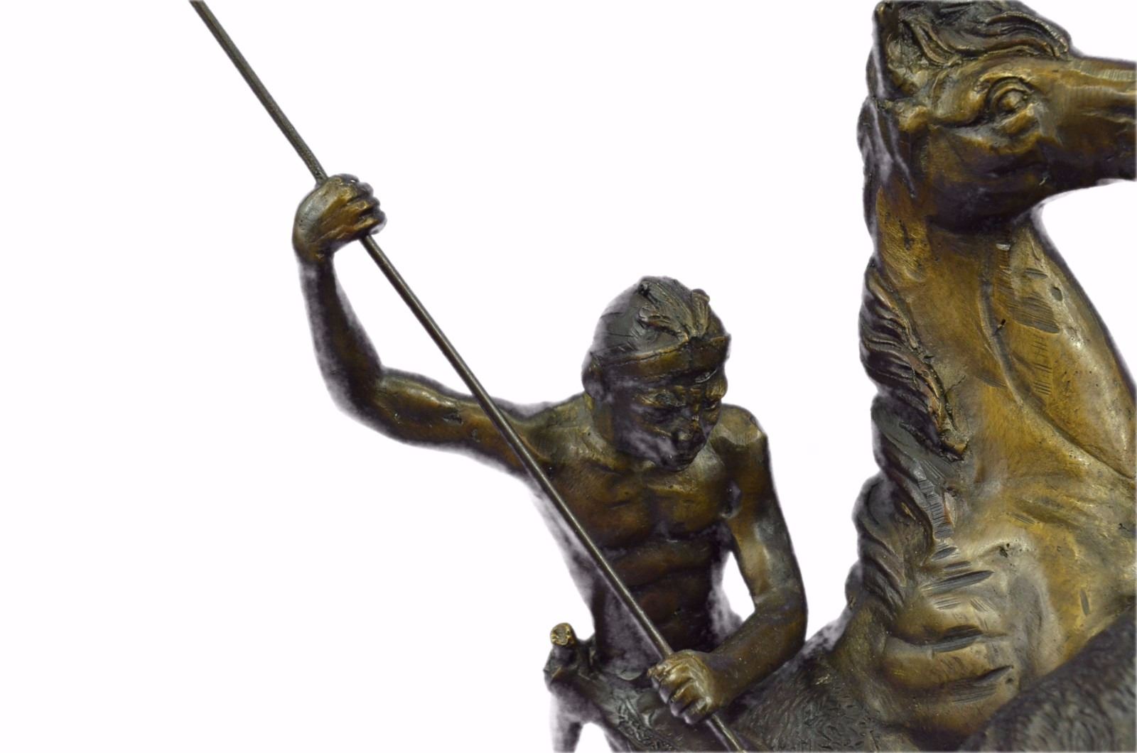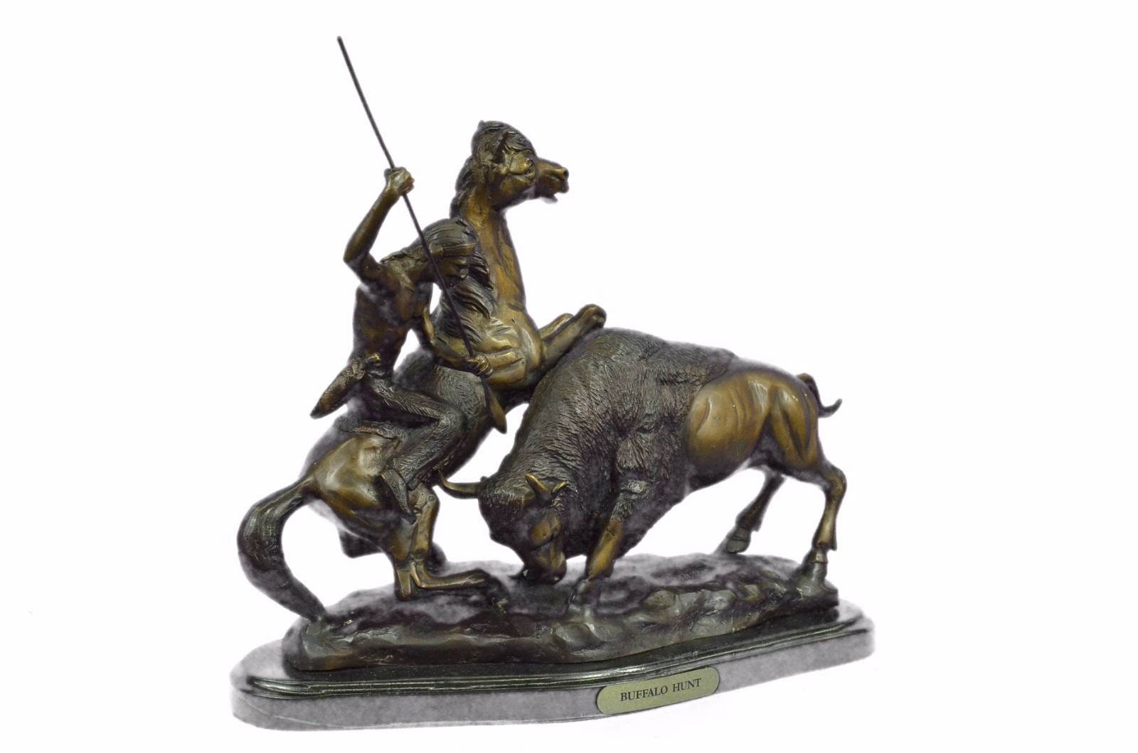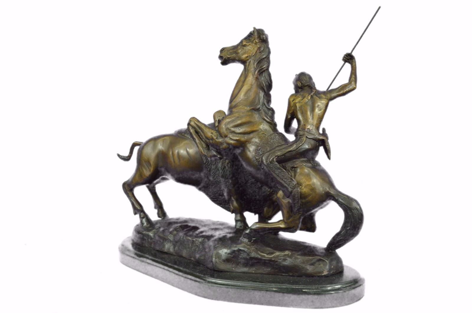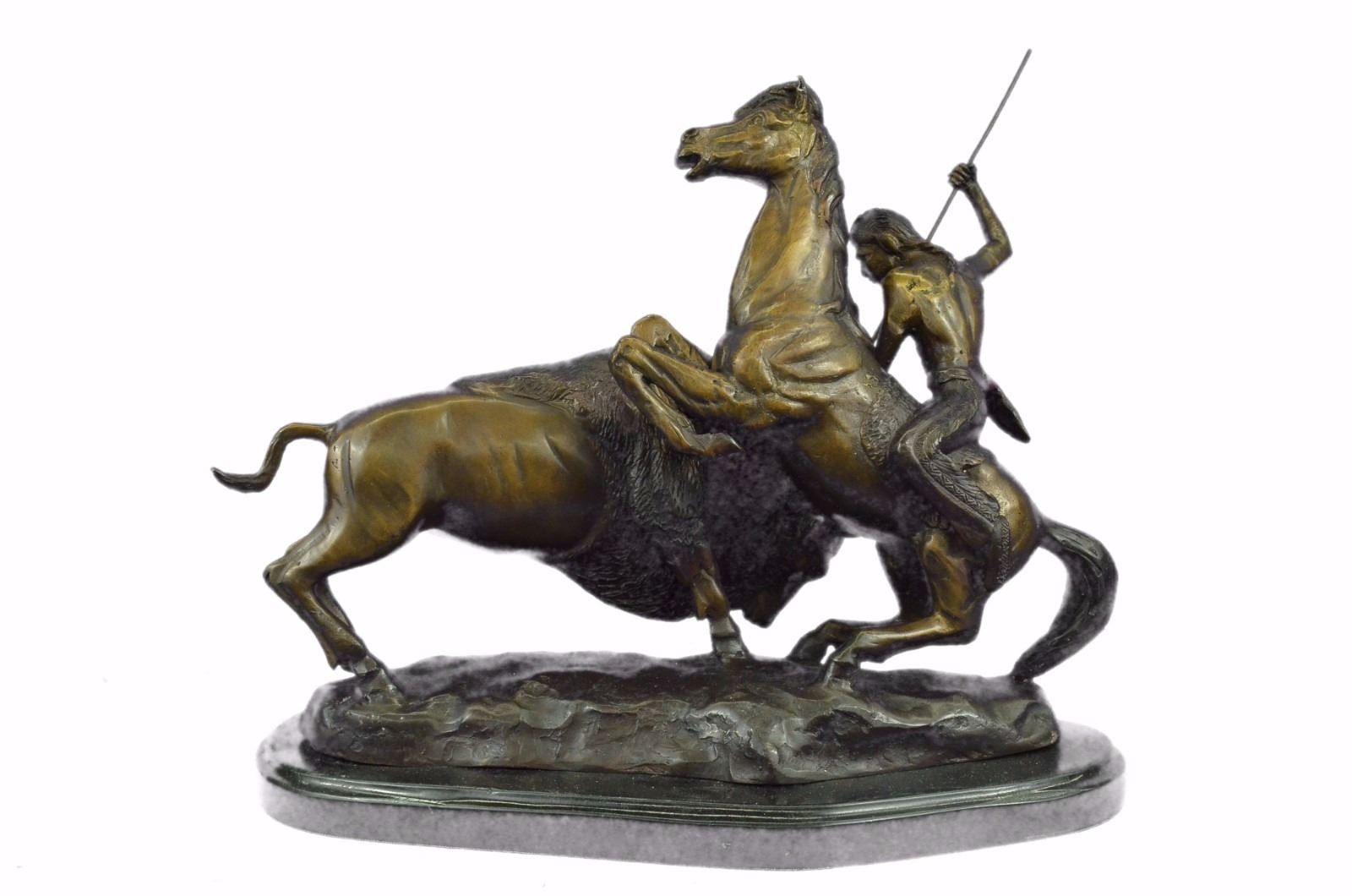 This Amazing Sculpture Is Of A Native American Hunter On His Horse Slaying A Buffalo With A Spear. He Sits Firmly On His Trusted Horse As It Rears Itself Up And Draws Back His Strong Arms That Hold His Spear. He Is Wearing An Elaborate Headband With Feathers From It Covering The Top Of His Head, A Tooth Necklace, Pants With Tassels And Beautiful Embroidery Down The Leg And Moccasins. His Hair Is Braided Thickly Down His Back And On His Belt He Holds A Knife He Crafted To De-Skin His Prey. He Respects The Animal And Will Use Every Part Of It To Provide His Town’S People With Clothing, Meat And Making Use Of Everything From Its Body. He Lifts Up A Long Spear He Made Specifically To Hunt The Buffalo And Raises It Above The Head Of The Beast. It Has Charged In His Direction And Caused His Horse To Rear Up, Giving Him An Advantage Angle To Take The Buffalo’S Life In One Quick Motion. Although The Warrior Is In An Intimidating Situation He Remains Calm And Confident Which Reflects In His Face. He Is A Healthy Middle Aged Man That Is Experienced In Hunting And Weaponry And Trusted To Be One Of A Few Sent To Bring The Buffalo. Handmade Of 100% Bronze And Cast Using The Ancient “Lost Wax Method”. Bronze Dimensions With Marble Base: Height 13 X Width 18 inches. Weight: 23 Lbs.
