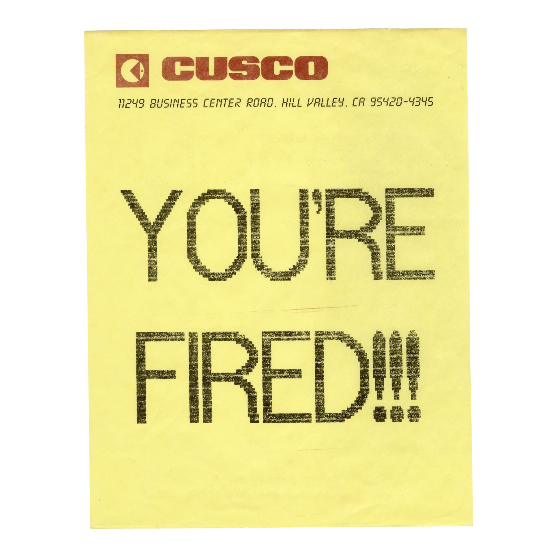 This yellow paper fax is labeled "YOU'RE FIRED" in comically oversized block text beneath a burgundy "CUSCO" logo and the company's Hill Valley address. The fax exhibits small markings from production. Dimensions: 8.5" x 11" (21.75 cm x 28 cm)