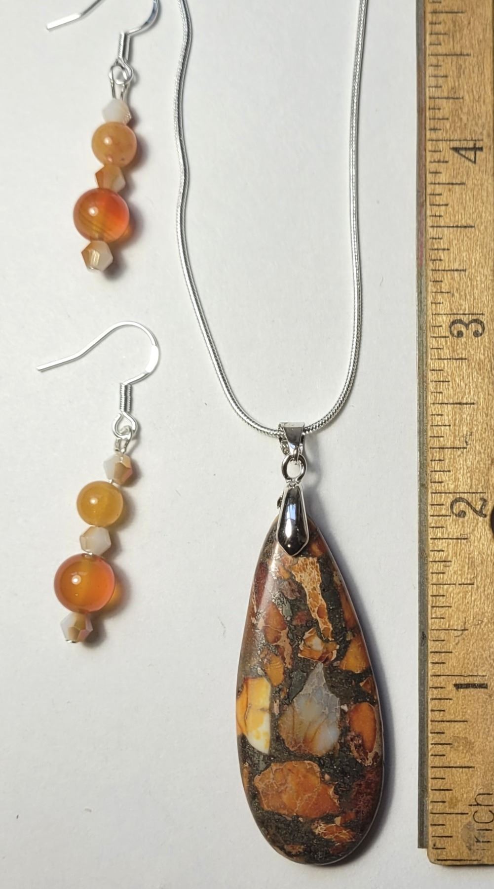 SEA SEDIMENT JASPER PENDANT ON 20" SNAKE CHAIN AND COORDINATING DROP EARRINGS. JEWELERY