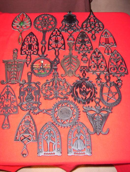 This is a collection of 23 trivets, all black cast iron, in a variety of shapes and designs. There are several makers marks on the bottoms, and they include Wilton, Adams, Emig, and Cathedral. A few are just marked Japan. All are in very good condition. We don't know the ages on all of these, but we believe most are antique.