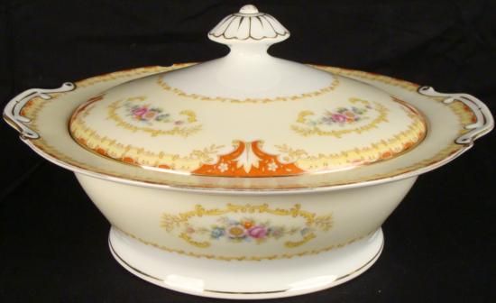 This is a 23 piece set of Ransom China, in pattern RNS3, made in Japan. It is in good condition overall, with minor marks showing on the white portions. The colors are bright and the details crisp. The pale yellow and soft floral designs are contrasted by a red border, and gold trim. * What follows is a complete list of what is included. The first number shows the total, and the number in parenthesis shows how many pieces have slight chips. There are no bad cracks, or transfer wear. * * * 9 7/8" dinner plates: 4 * 6 1/4" salad/dessert plates: 10 (2) * 3 7/8" teacups: 5 (2) * 5 1/2" saucer: 2 * 10 5/8" oval vegetable dish: 1 * 9 1/4" covered casserole dish: (1) -slight rim chip * This is especially nice China to adorn the dinner table. *
