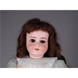 23” S P B H. Brown glass sleep eyes with eyelashes, fine bisque is on a fully jointed composition body. Wearing an older sheer aqua dress with white undergarments. CONDITION: Composition body repainted. Wig glued tightly to head, but upon inspection it appears to be fine. JL 1-2594
