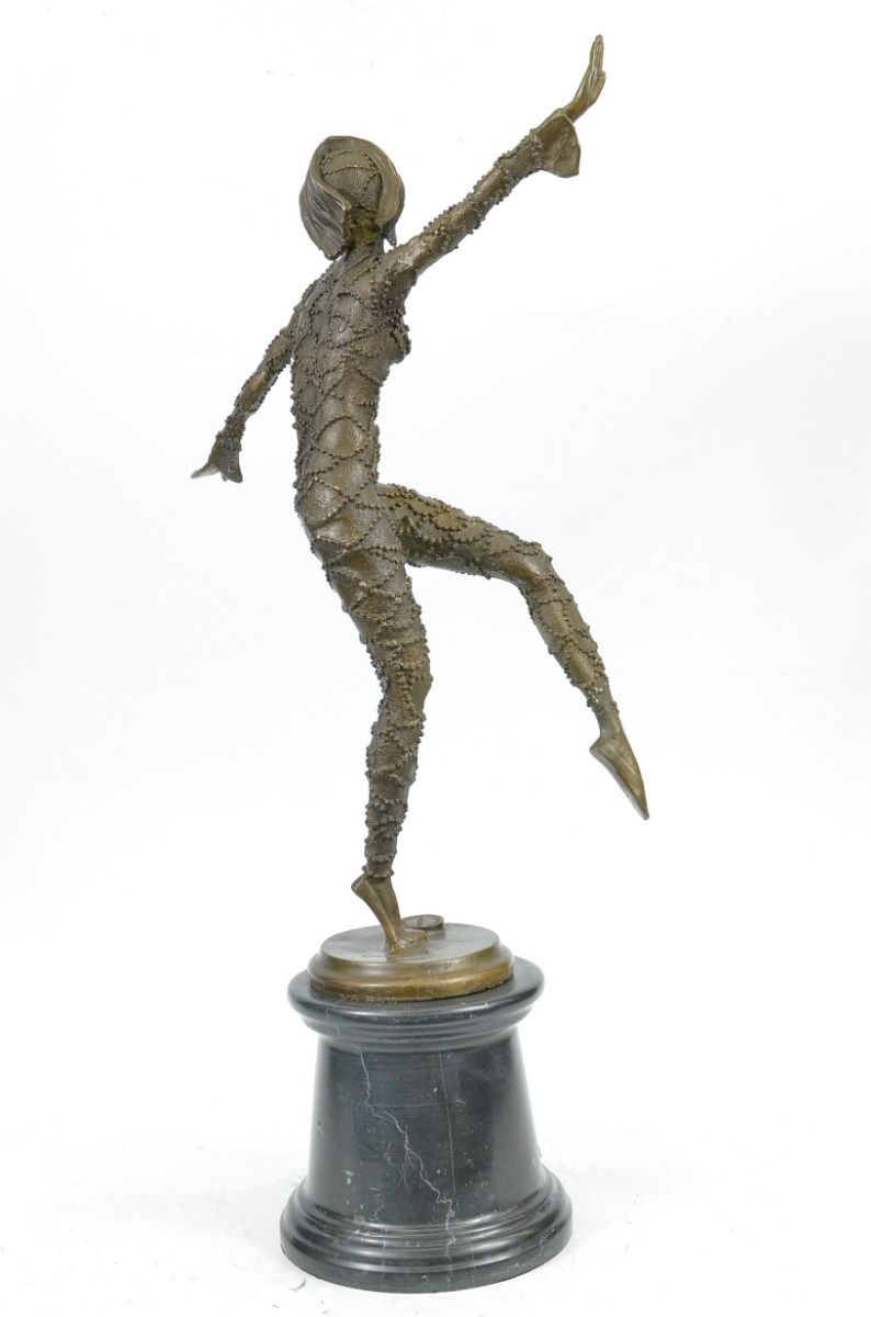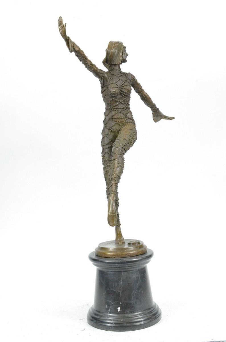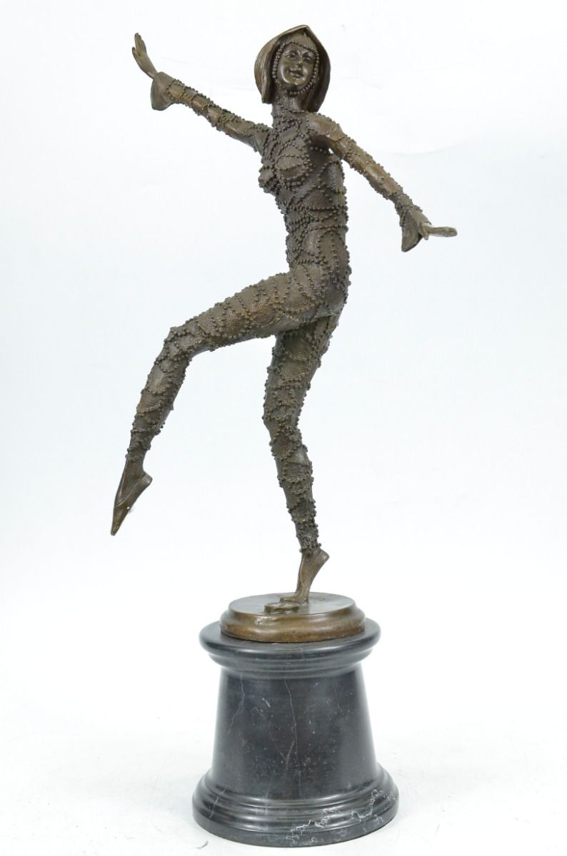 11XN218880 This Lovely Chiparus Dancer Is Performing For A Crowd Of People. She Has This Gorgeous Body Suit That Covers Her Head To Toe Designed With Lines Of Different Shapes. She Dances With Both Her Arms Extended Out To Her Sides And Her Head Moving From Left To Right To The Music. She Stretches Her Left Leg Up As She Stands On The Ball Of Her Right Foot. She Is Cast Using The Ancient Old "Lost Wax Method" Stained In A Two Tone Brown Patina. Mounted Up Top A Black And Marble Base, Signed By The Artist D.H. Chiparus...................SHIPPING USA: $25....HI, ALASKA, CANADA: $69...ALL OTHER COUNTRIES: $169