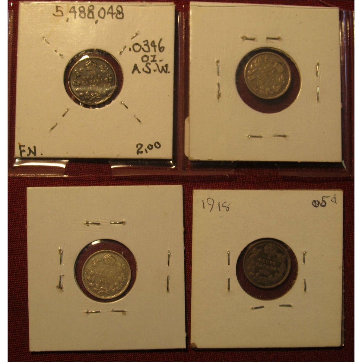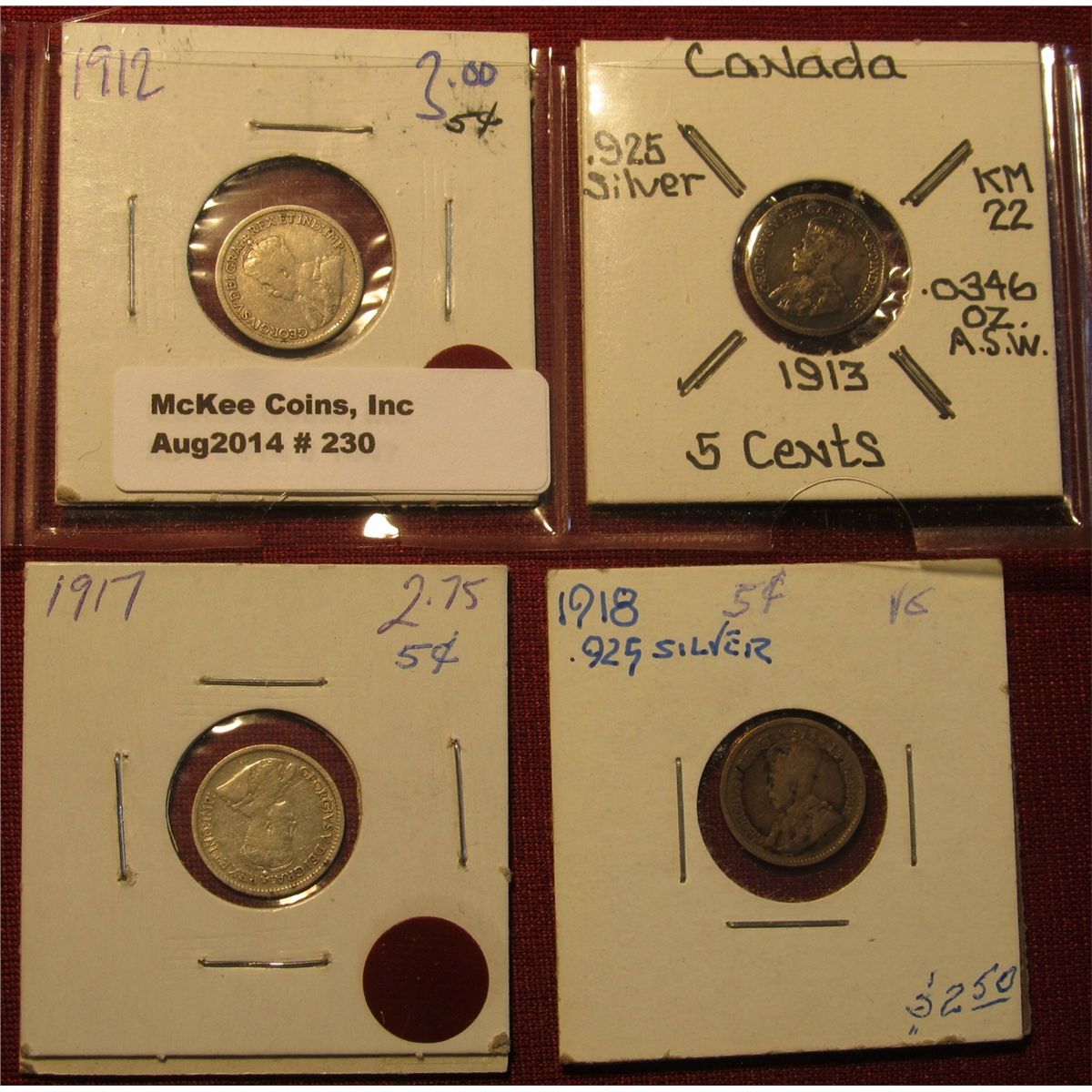 230. 1912, 13, 17, & 18 Canada Five Cent Silvers. VG-F.