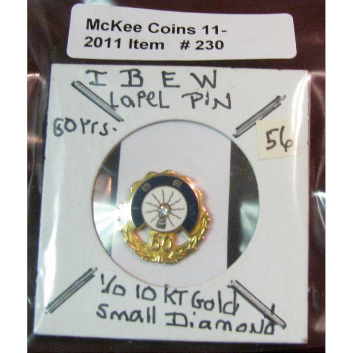 230. I.B.E.W. Lapel Pin 60 Years. 1/10 10Kt. Gold with small diamond.