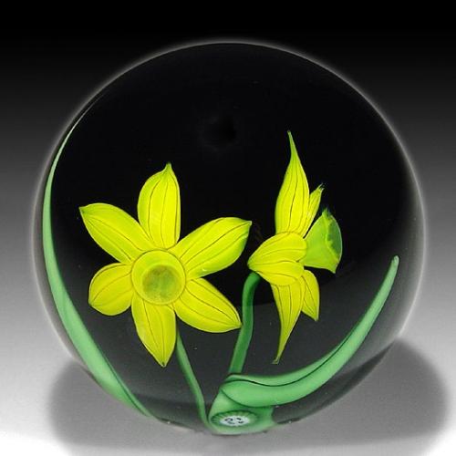 Orient & Flume Art Glass 1984 "Daffodil" surface design paperweight, with two yellow daffodils and long green leaves, on a glossy black surface. Signature/date cane. Signed/dated, by Bruce Sillars. Diameter 3". NO RESERVE